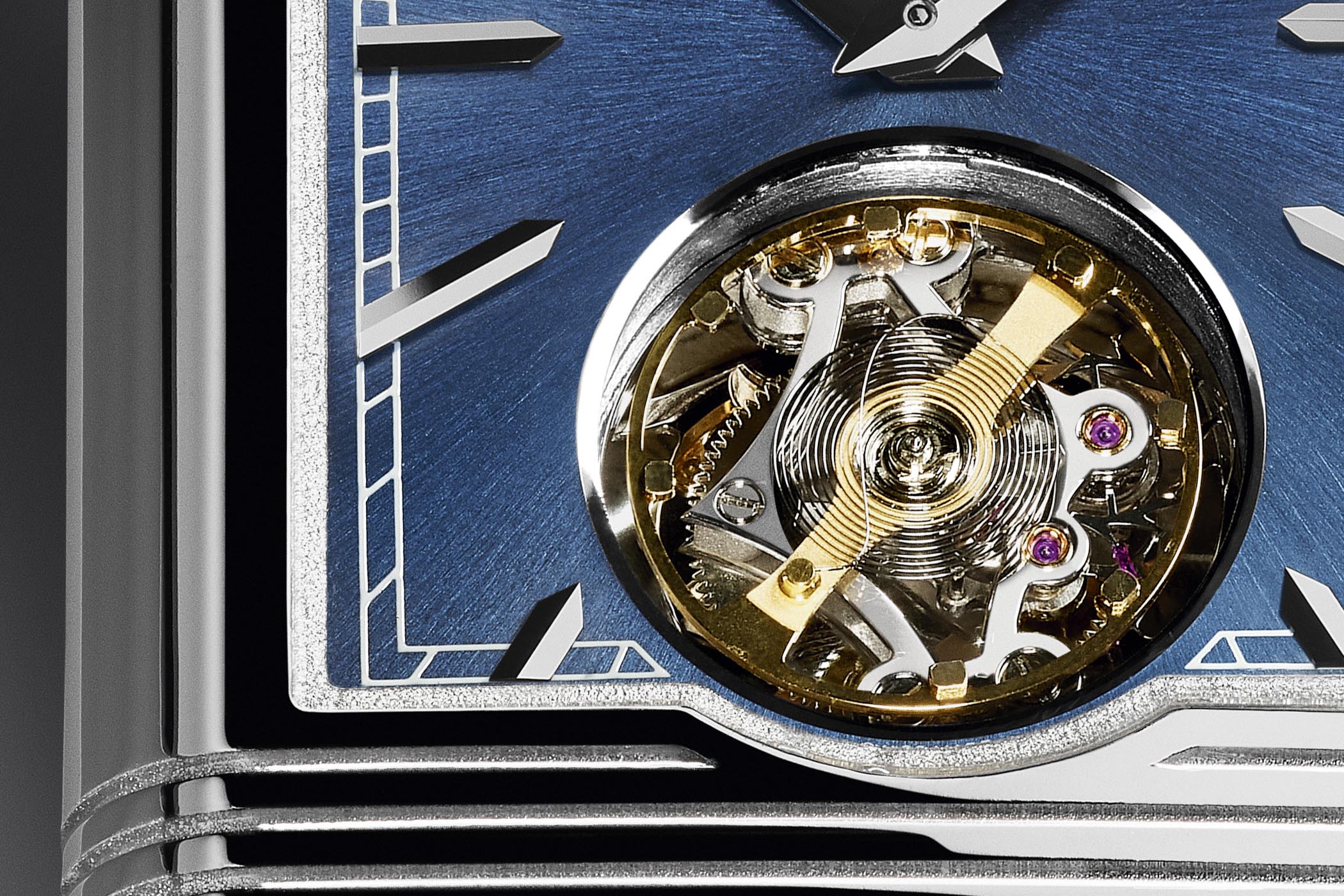 As always with twin dial watches by JLC, the Reverso Tribute Tourbillon Duoface has two faces. The first one – the one that seems to be the daily wearer – shows a classic sunray brushed blue dial with Dauphine hands and applied indices. Hours and minutes in the centre and a large aperture at 6 o’clock to display the ballet of the flying tourbillon – without an upper bridge and with its hairspring unusually placed on top of the module.