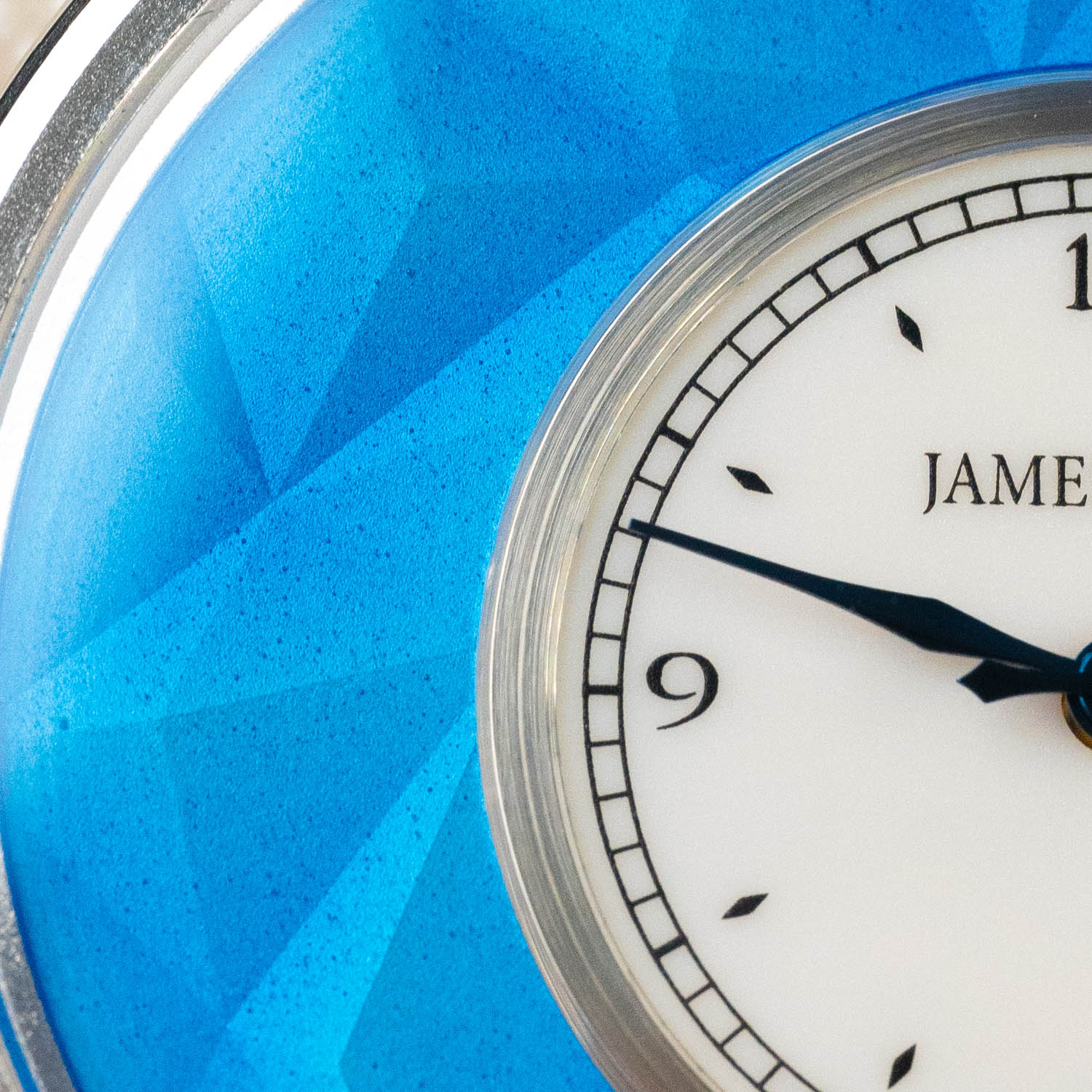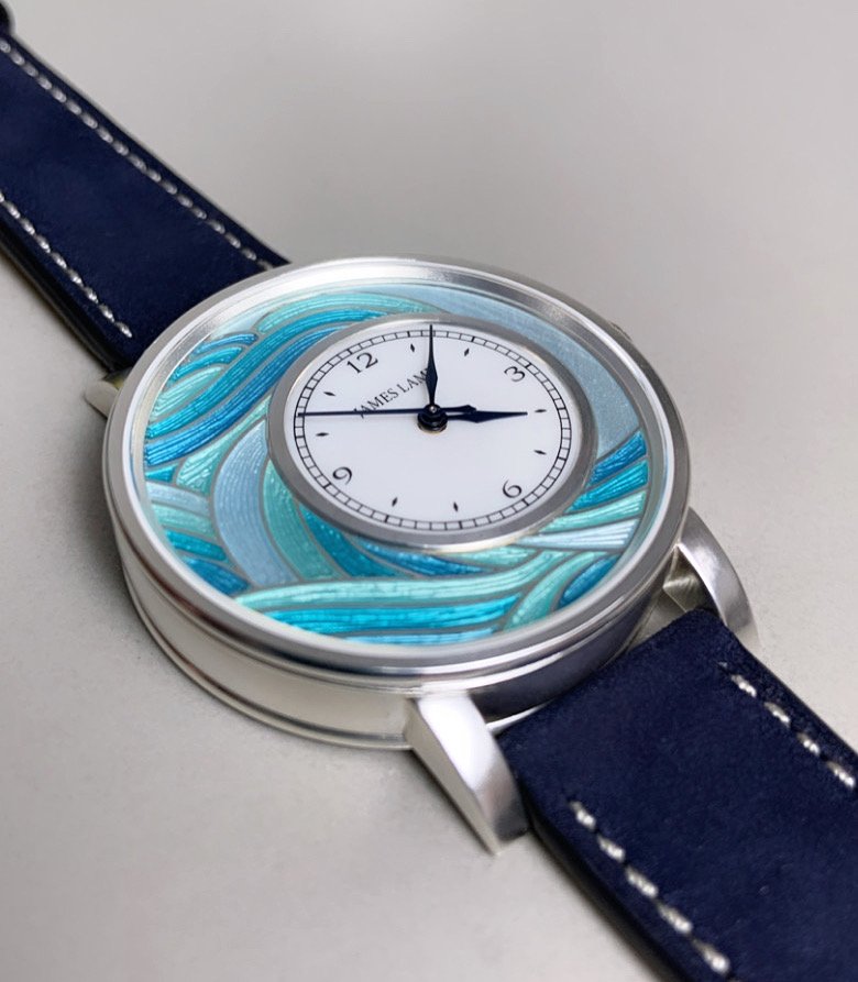 The Origin Series was inspired by nature’s elements – fire, water, air and earth – and used champlevé vitreous enamel colours and decoration. At the same time, respect for traditional watchmaking was the driving force for the artisanal presentation. James Lamb chose to make the cases by hand himself, a rare endeavour among the independent masters, as most prefer to order them elsewhere. And he chose Argentum silver for the case material.