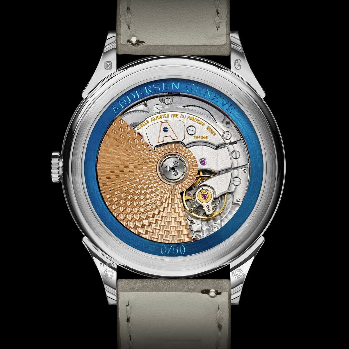 The back reveals an automatic movement to power the in-house jumping-hour module on top. The base is a Fre?de?ric Piguet 11.50 movement, a slim calibre equipped with two barrels and providing a comfortable 72h power reserve. It’s mostly its decoration that catches the attention, with Geneva stripes, anglage, perlage and mirror-polishing of the screw heads. The movement is wound by a solid gold rotor decorated with a guilloché grain d’orge pattern and encircled by a ring of 21k BlueGold (produced thanks to a unique heat-treating process).