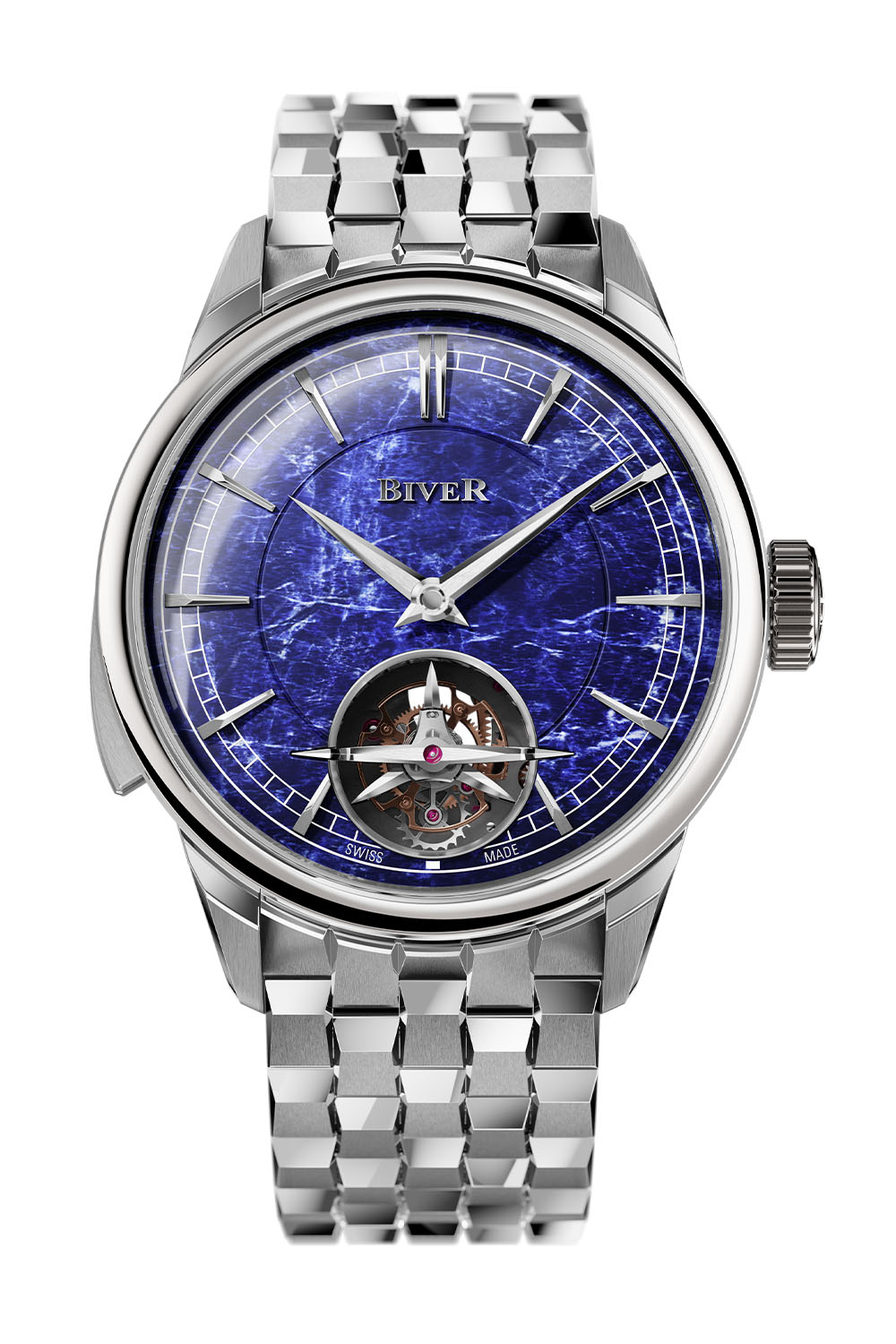 The Carillon Tourbillon Biver is presented in a 42mm round case with a concave bezel, case bands and caseback. The large crown and the angular soldered lugs add to the bold character of the watch. The water-resistance is rated at 50 meters. A bold design choice, the dials are made of hard stone, with silver obsidian or sodalite. These are domed and feature superbly finished curved indexes paired with hand-polished dauphine-style hands. The one-minute tourbillon rotates at 6 o’clock under a bridge matching the design of the hands.