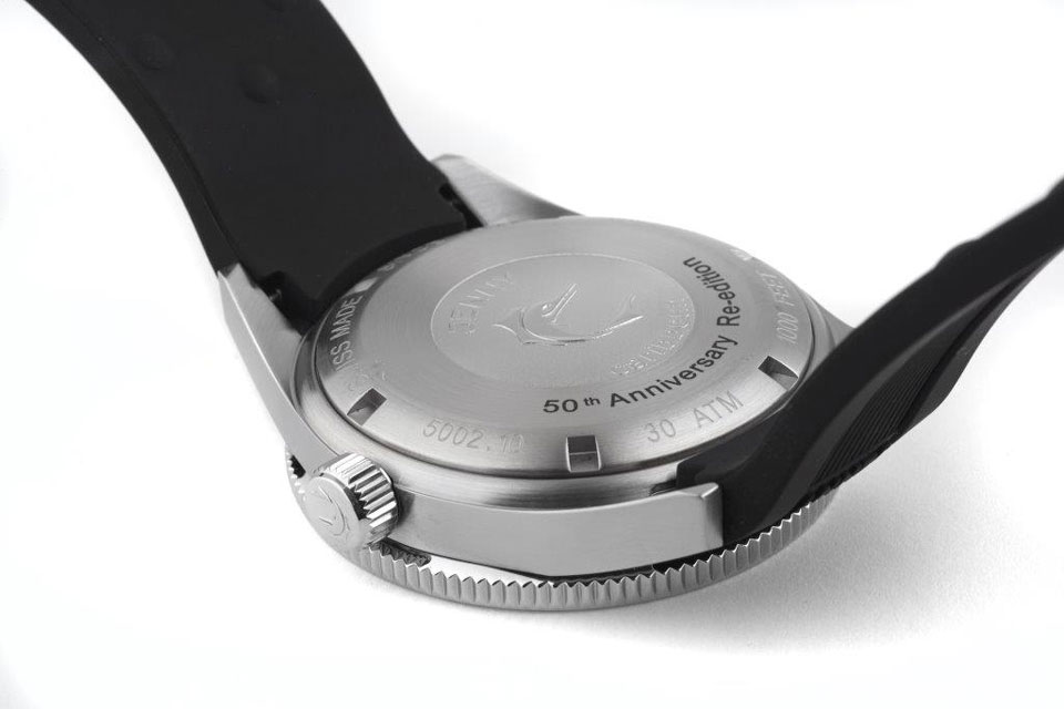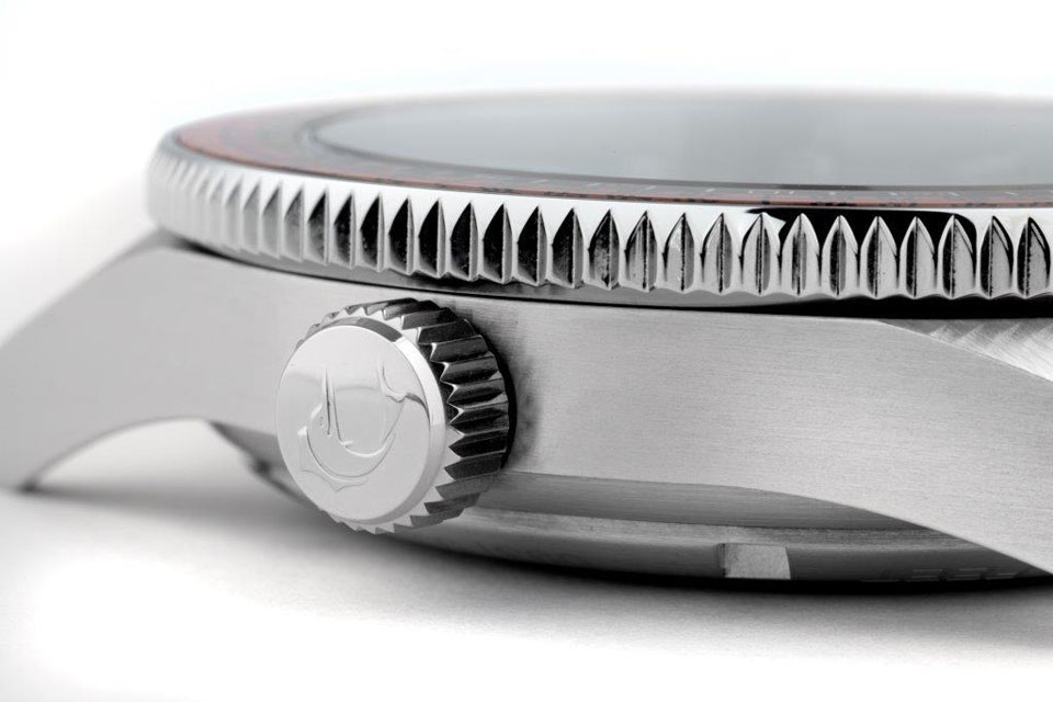 The satin brushed, solid 316L stainless steel case measures 42mm in diameter (excluding crown) and is (just) 12.3mm thick. Inside ticks a high-grade ETA 2824-2 self-winding movement with a custom ‘Jenny’ engraved rotor. This über-reliable movement features a hacking second function, a quick-set date function and a power-reserve of 42 hours. The flat sapphire crystal comes with an anti-reflective coating, the steel screw-down crown has the Jenny fish logo embossed, and so does the solid stainless steel case-back that has also been engraved with its unique Limited Edition number.