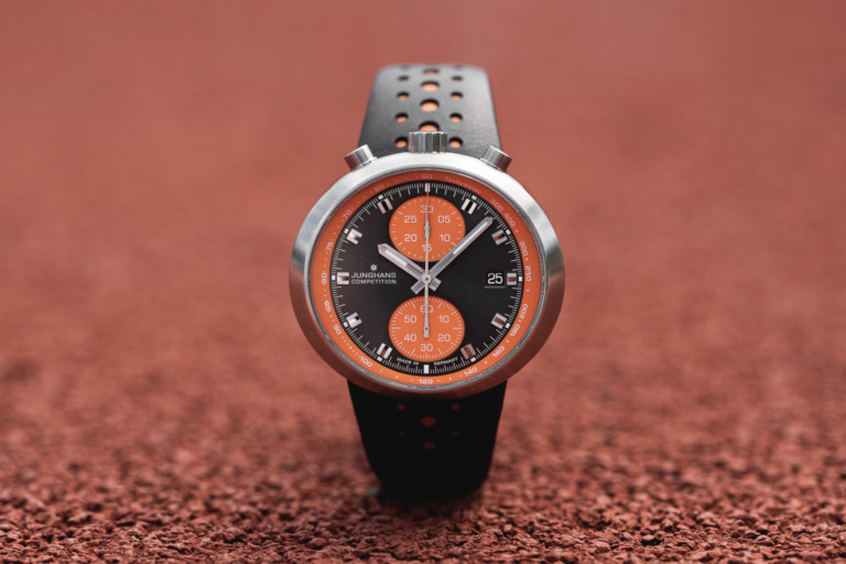 Identical in build to the 1972 Competition chronograph released in 2022, the 1972 Competition FIS Edition Lemon adopts the profile of a handheld stopwatch with the pushers and crown placed on the top of the case (bullhead). It’s worth mentioning that Junghans also produced stopwatches in the 1920s and set timing standards in downhill and slalom disciplines.