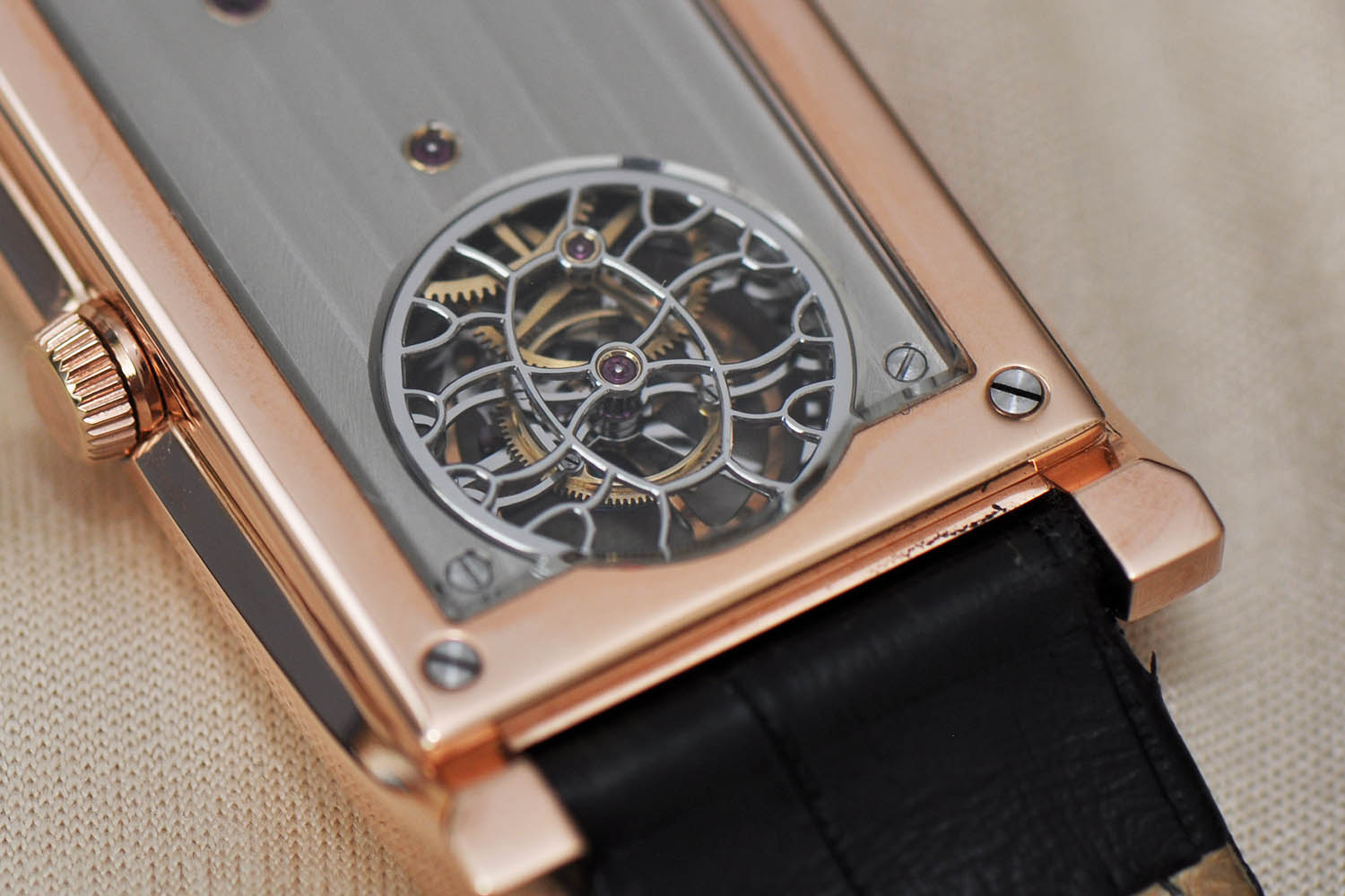 The case of the Kaj Korpela “Timepiece No. 1” tourbillon is clearly Art-Deco, with a shape reminiscent of 1920s timepieces, as seen at Cartier, Rolex (the Prince) or Patek Philippe (the Gondolo). It is a 43.4mm x 25.7mm case, meaning a rather sleek shape, thin but long. The overall thickness is very low, at 8.5mm. The profile shows a nice curve, embracing the lugs and the casebands, virtually enlighten again the profile.