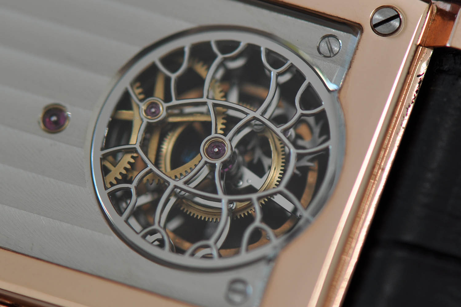 On the front of the watch, the tourbillon is held in place by another nightmare for finisseurs; a rounded and mirror polished bridge, with a gold chaton in the middle – which of course can only be achieved by hand – and talented hands.