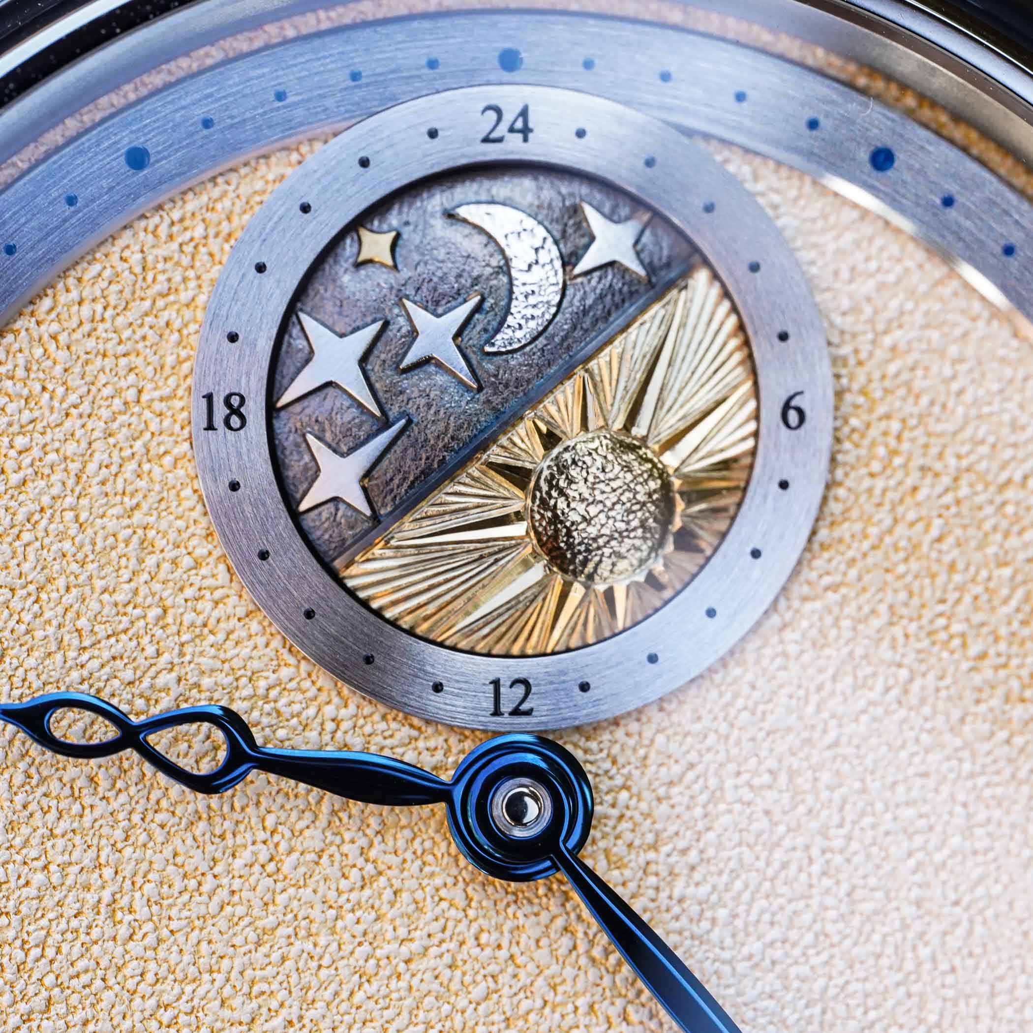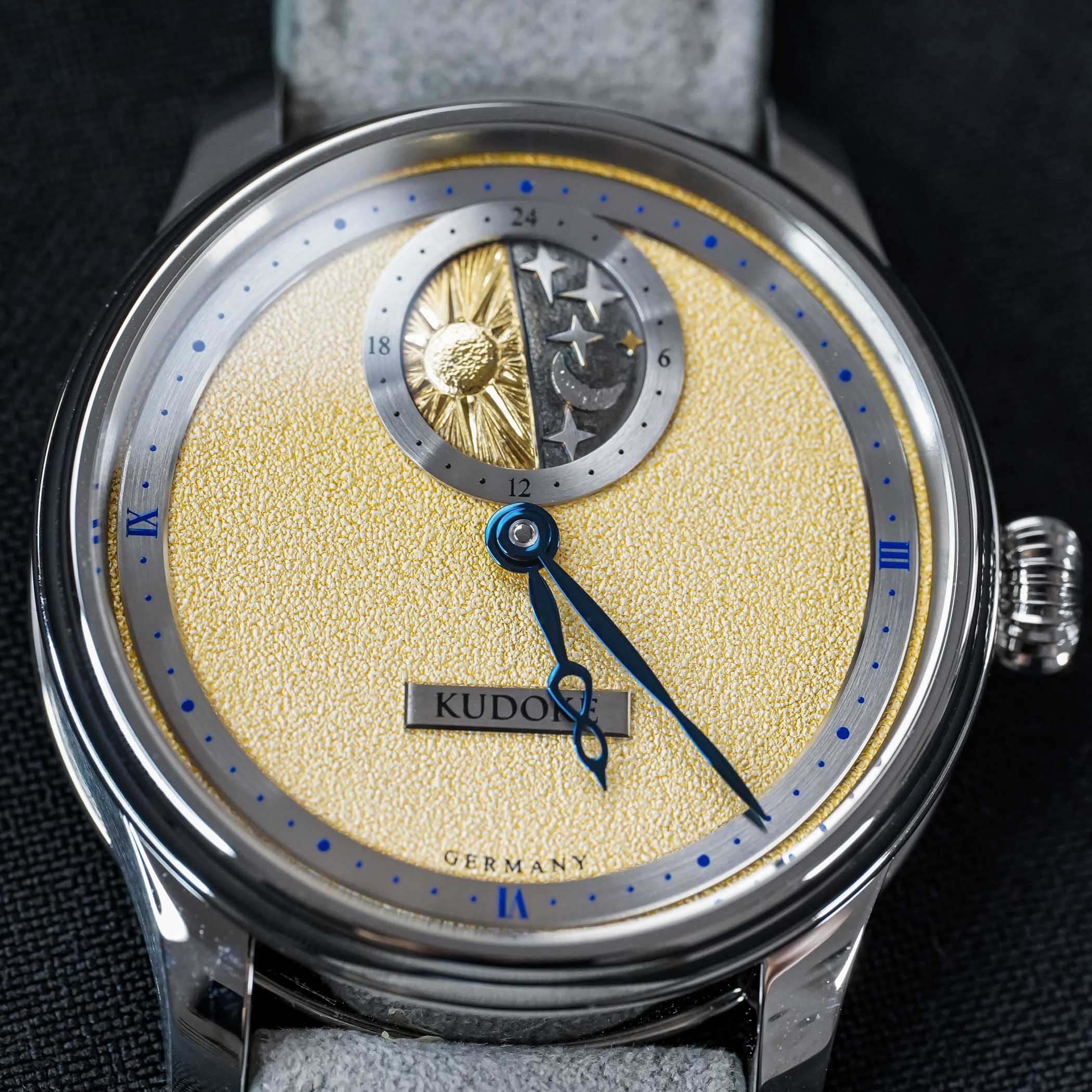 The domed day/night disc at noon rotates in a 24-hour cycle and is entirely engraved by hand. Representing the golden Sun and the Moon surrounded by silver stars, a solitary golden star indicates the time of day on the applied peripheral scale. The applied rhodium-plated chapter ring has a matte satin finish and displays blue lacquered Roman numerals at III, VI and IX along with dots, details that underscore its British character. The hour hand, with a tip shaped like an infinity symbol, and the minute hand are made in steel and blued by hand. Like other Kudoke 2 models, the brand name is placed on an appliqué in the lower half of the dial, and the word ‘Germany’ is printed just above the 6 o’clock marker.
