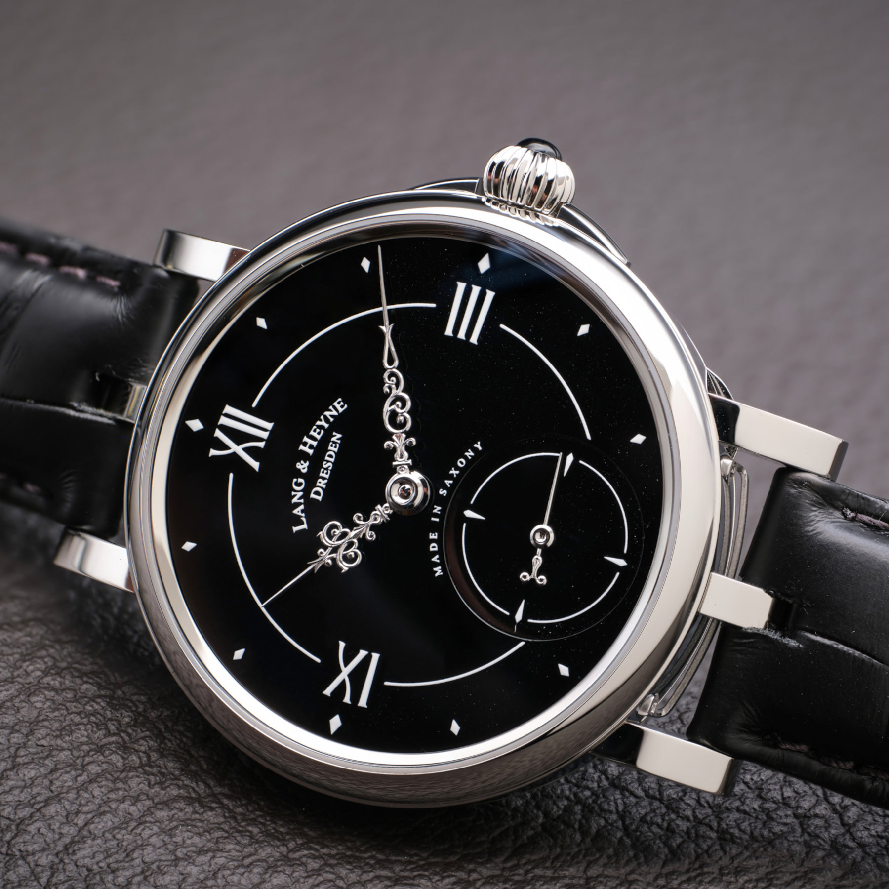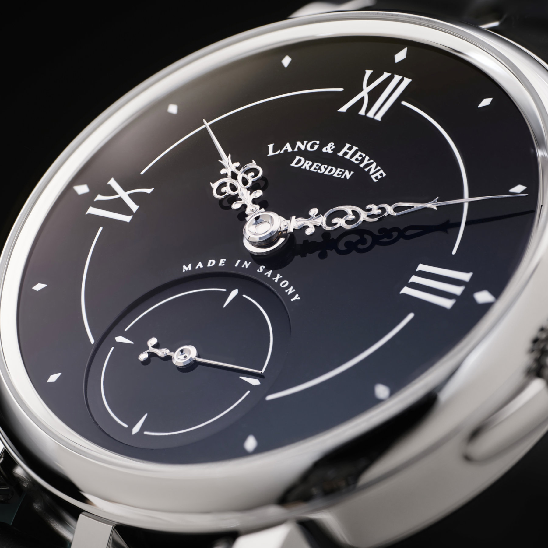 The two-part dial is crafted from white gold and features deep black champlevé enamel for a striking finish. The Roman numerals are intersected by finely printed lines and accompanied by diamond-shaped markers on the outer edge. One step further out, we find a polished rehaut, a first for Lang & Heyne. The sunken small seconds display has a similar minimalist sectored design. What stands out are the stainless steel Louis XV hands, which are entirely handcrafted. It might not be to everyone’s liking, but the craftsmanship is undeniable!