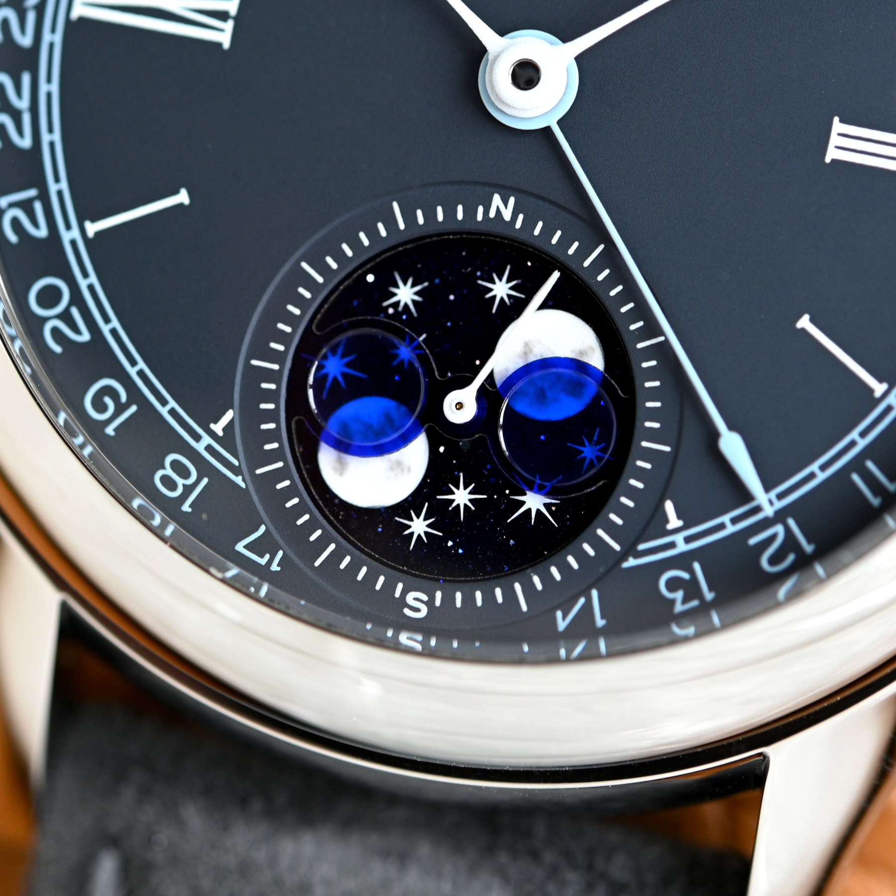 Also, some will notice that the small seconds counter has been enlarged, and that is to make room for the main novelty: a moon phase indicator. A first for the watchmaker, an enigmatic dark blue moon disc represents the cycles of the moon. First, aventurine glass from Murano artisans is engraved to create the shape of the moon and stars with hand-applied white paint for the details. The moon and stars are then hand-filled with Super-LumiNova and fired at high temperatures. Afterwards, the Super-LumiNova is engraved to create craters on the moon’s surface. Finally, a translucent petrol blue enamel applique is applied on top. This double moon indicates the phases of the Northern and Southern Hemispheres.