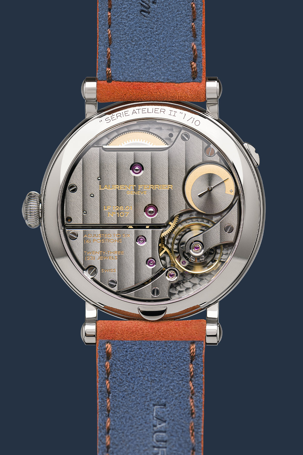As for the display and the calendar module, nothing has changed. There’s still this great annual calendar function that only needs one correction a year since it can compute months with 30 or 31 days. The display consists of central hours/minutes, a small seconds, a pointer-date with numerals on the periphery as well as two bevelled windows for the day of the week and the month. Powering the Laurent Ferrier Montre Ecole Annual Calendar is a proprietary hand-wound calibre equipped with a classic Swiss lever escapement. Powerful, with its 80-hour autonomy, it is also exquisitely decorated with thin Geneva stripes, hand-polished anglage, and a blade click for the barrel. A power reserve indicator sits discreetly on the movement side.