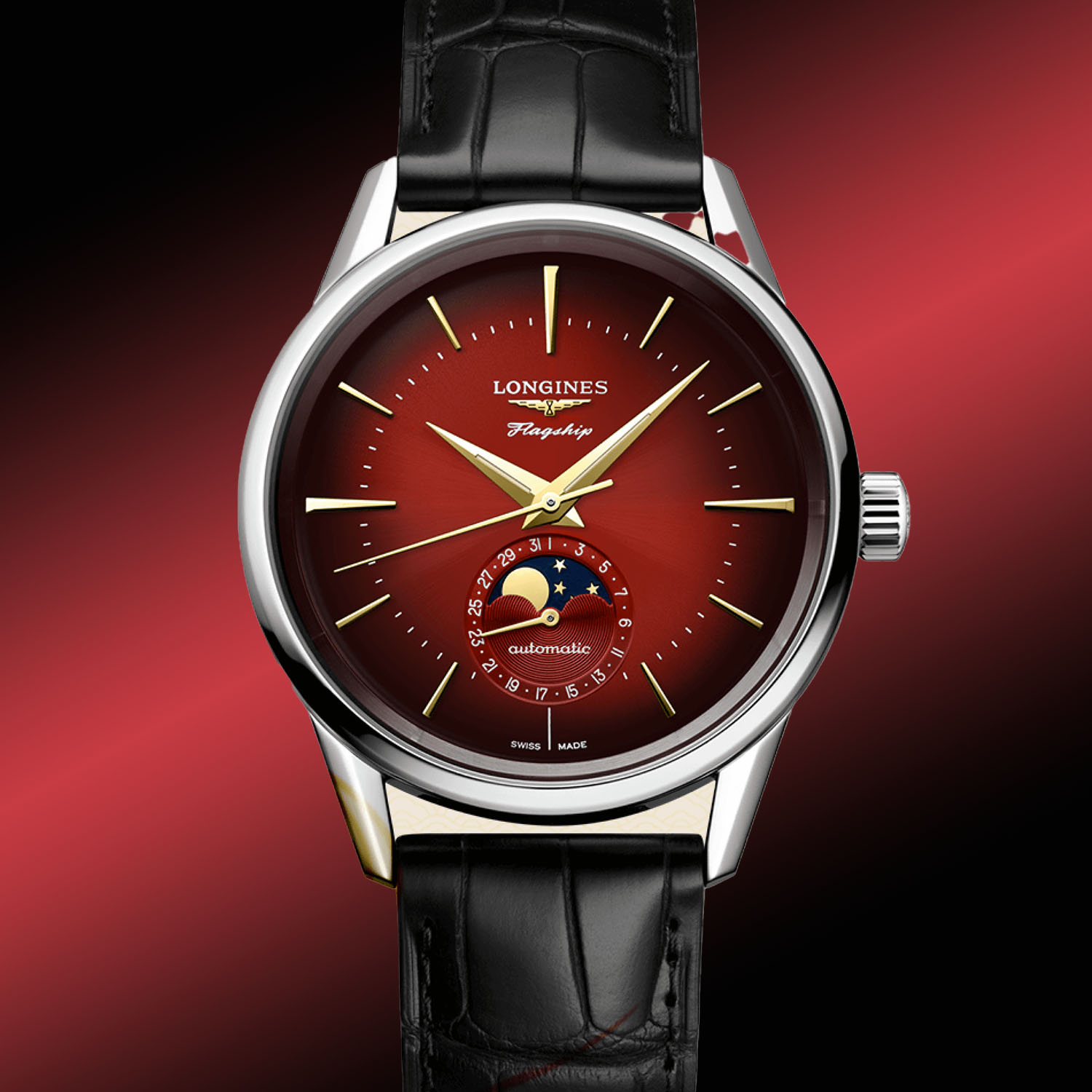 Celebrating the Chinese New Year, Longines has selected a vibrant tone of gradient red for the domed dial that is brighter in the centre and darker as it reaches the periphery. The colour red is highly symbolic in Chinese culture and is associated with festivities, good luck, wealth and happiness. Knowing that the combination of gold and red is even more auspicious, Longines uses gilt appliques on the dial. The elongated and applied indices, the hands and even the winged hourglass logo are golden. To enhance legibility, the dauphine-style hands have a strip of Super-LumiNova.