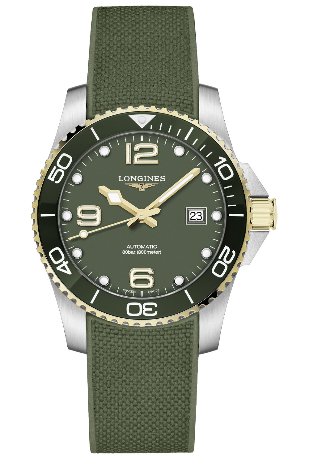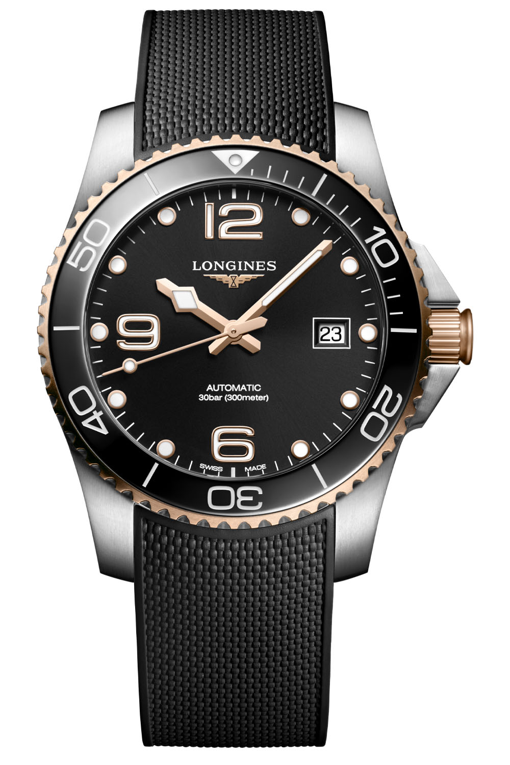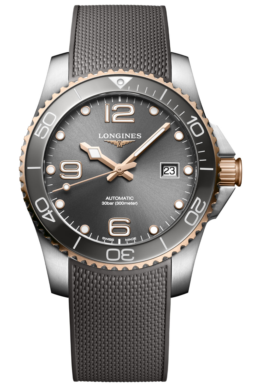 It is the solidity and accessibility of the Longines HydroConquest watch that lends itself as such a useful tool for amateur and professional divers. That said, the robust yet classically designed watches from this collection are more than at ease on dry land too. The Saint-Imier-based manufacturer first launched the HydroConquest watch in 2007 but redesigned it in 2018 with colour-coordinated dials and ceramic bezels in black, blue or grey, an improved movement, two case sizes of 41mm or 43mm, and a metal bracelet or rubber strap option. Since then, Longines has also released an all-black ceramic model and a green dial/bezel version. Now Longines extends the HydroConquest watch collection with a series of two-tone versions available in steel and yellow gold PVD or steel and rose gold PVD. These green, blue, black and grey dial colour options are only available in the 41mm case size but come equipped with a movement promising an extended power reserve.