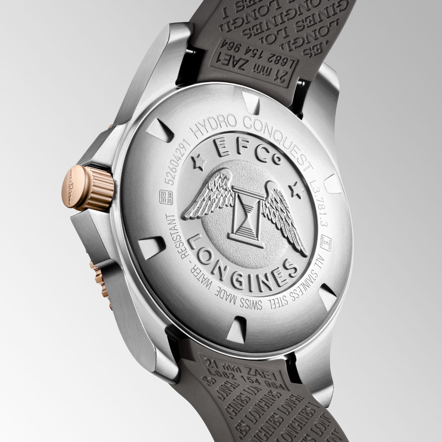 The new Longines HydroConquest two-tone use the self-winding L888 calibre. The movement comes with an improved 72-hour power reserve compared to the previous 64-hour running time of 2018 models. It also comes with a silicon balance-spring to protect against magnetic forces and beats at a rhythm of 25,200 vibrations per hour.