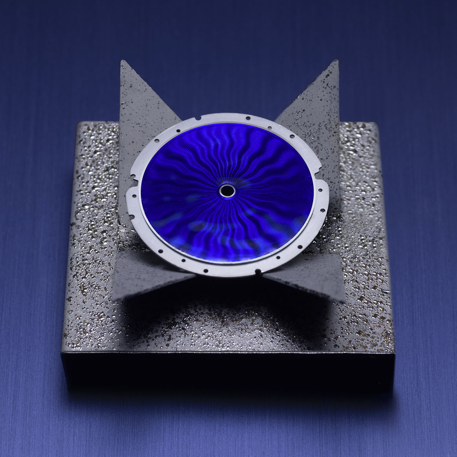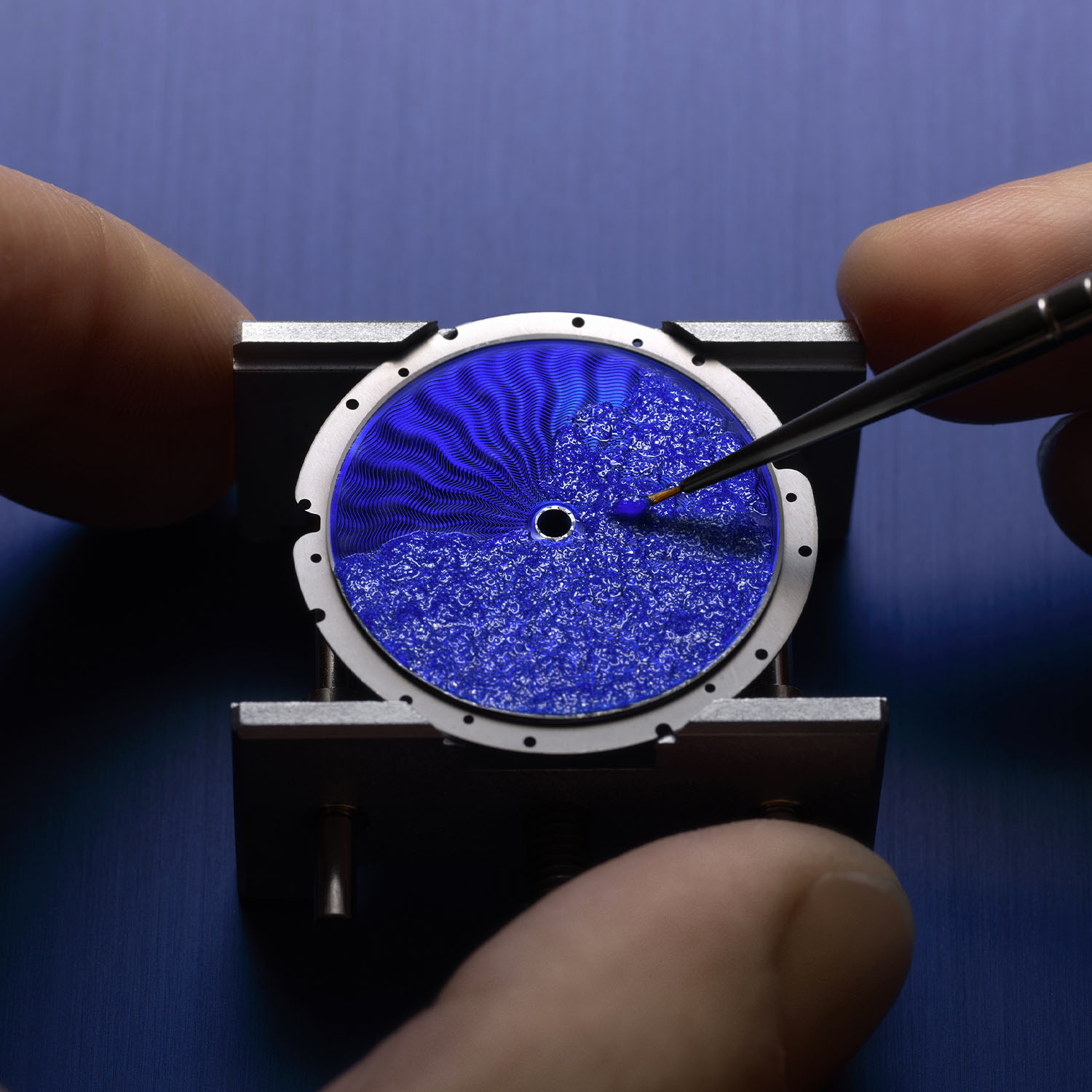 The dial is an ode to traditional métíers d’art skills like guilloché engraving and champlevé and flinqué Grand Feu enamel techniques. The incredible blue dial ripples with texture and plays with colour to great effect. The first stage involves a solid gold disc with a tiny, raised lip to contain the enamel. The recessed centre is engraved on a hand-operated rose engine to create the hypnotic radial guilloché pattern. An enameller then mixes the enamel pigments and applies them using the champlevé technique to fill the recessed cells. The dial is enamelled on both sides. Known as counter enamel, the coating on the reverse side prevents deformation during firing. After repeated enamel applications and stints in the 800-degree kiln, the translucent enamel reveals the refined guilloché pattern.