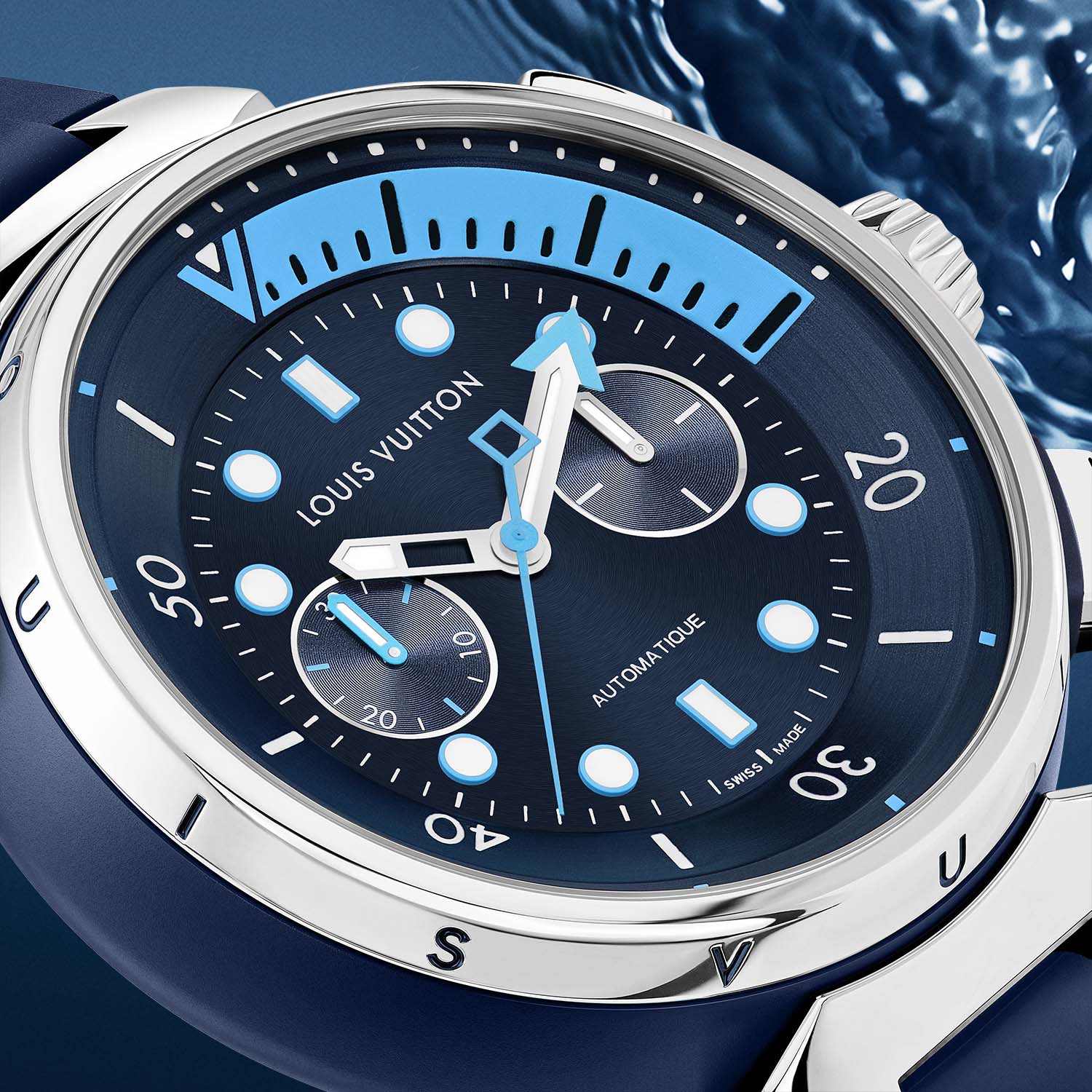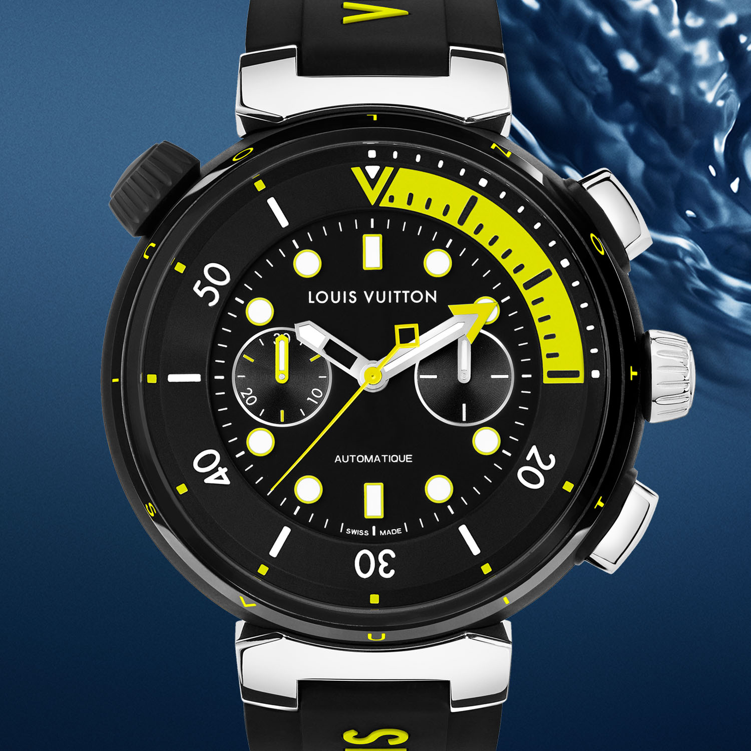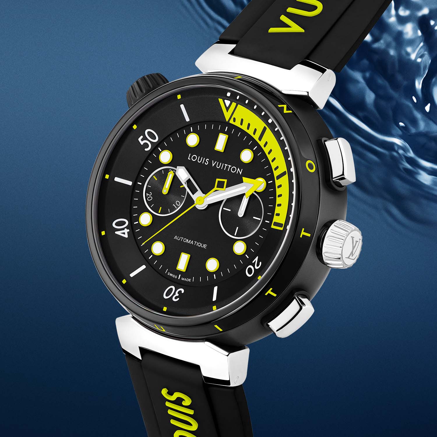 With its thick 14mm height, there is plenty of retail space on the case for branding and the 12 letters forming “Louis Vuitton” are engraved into the bezel flanks and filled with blue or yellow to match the colour scheme of the watch. The polished steel screw-down crown on the right bears the LV monogram, while the compressor-style crown on the left, used to manipulate the 15-minute diving bezel, is coated in black or blue PVD.