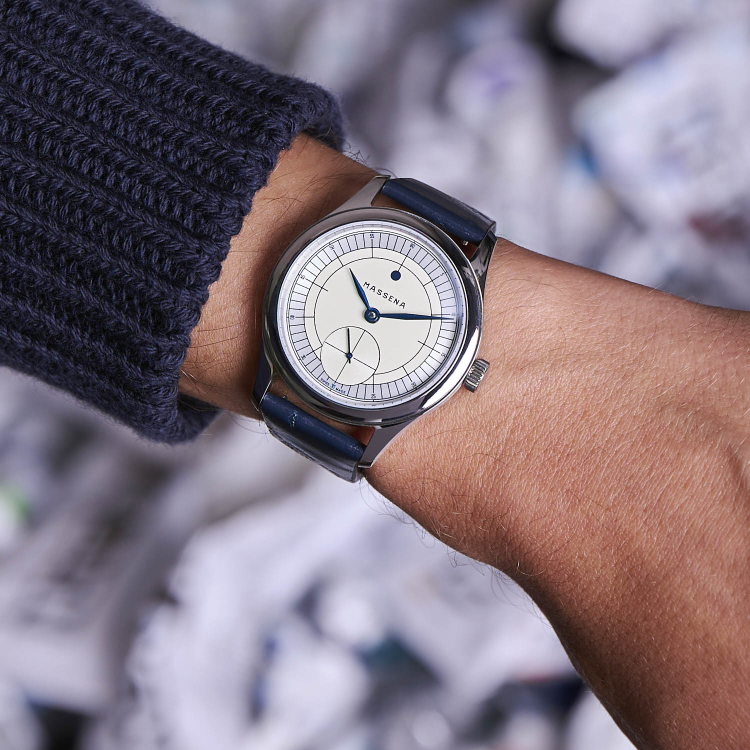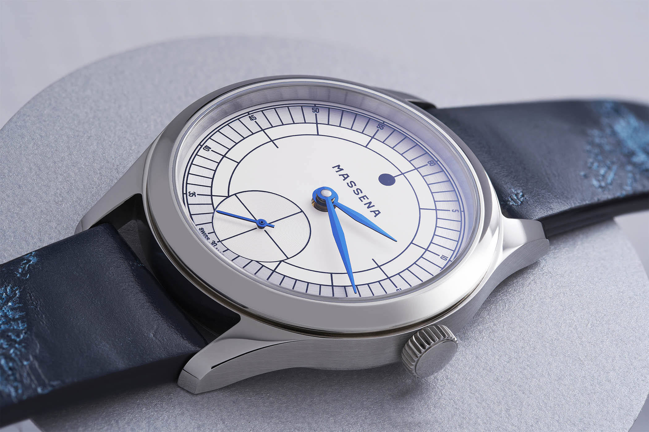 The dial is, once again, very Massena in terms of style. The look has been modelled after “a mysterious pie?ce unique, commissioned in 1933 by a leading luxury retailer in Berlin.” It feels, however, slightly different from the usual sector dials William has been making in the past, with a more technical, even sleeker look that is reminiscent of the Bauhaus era – it indeed favours geometric shapes over elaborate ornamentation. Minimalist in style yet focused on precision and ease of reading, the dial is off-white in the centre with a matte surface and features a circular-grained and rhodium-plated outermost sector ring. The dial is then intersected with a radially grooved small-seconds subsidiary dial. The finishing touch is the use of heated blued steel hours, minutes, and seconds hands. A highly modernist look…