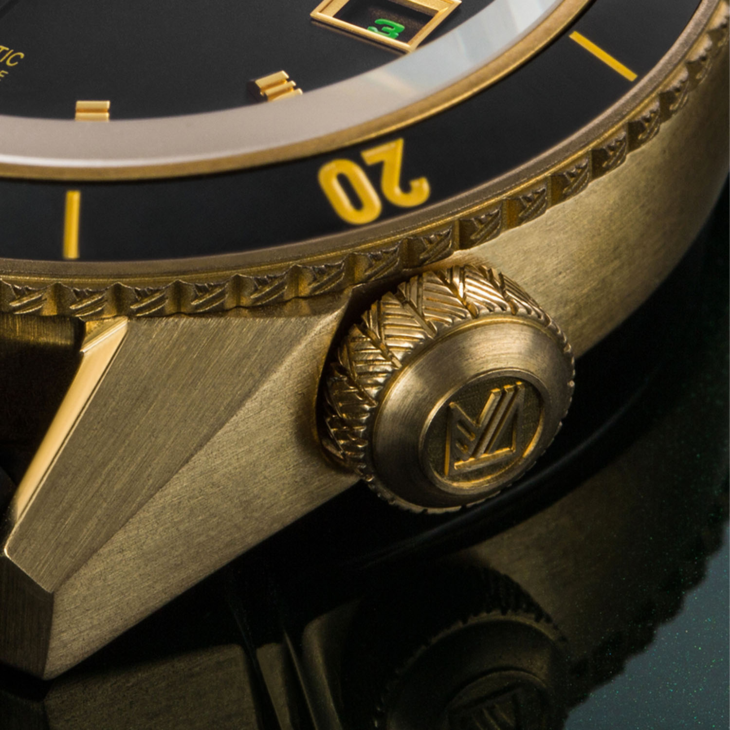 Just before we look at the watch, the name Bonzer is taken from the legendary surfboards made in the 1970s by brothers Duncan and Malcolm Campbell. Like black-and-gold John Player Special models, the combination of bronze and black makes for a very attractive, verging-on dressy watch. It is an oxymoron in the context of a surf/dive watch, but it works very well as a stylish sports watch. The case has a diameter of 41mm, a thickness of 12.25 and a 100m water-resistance. It is crafted in bronze with a predominance of brushed finishings and polished accents on the inner face of the lugs. However, it also features some finishings that are rarely seen on a dive/surf watch. Inspired by the brand’s logo, the knurled bezel is chiselled with a series of intertwined lines matching those on the screw-down crown at 4 o’clock.