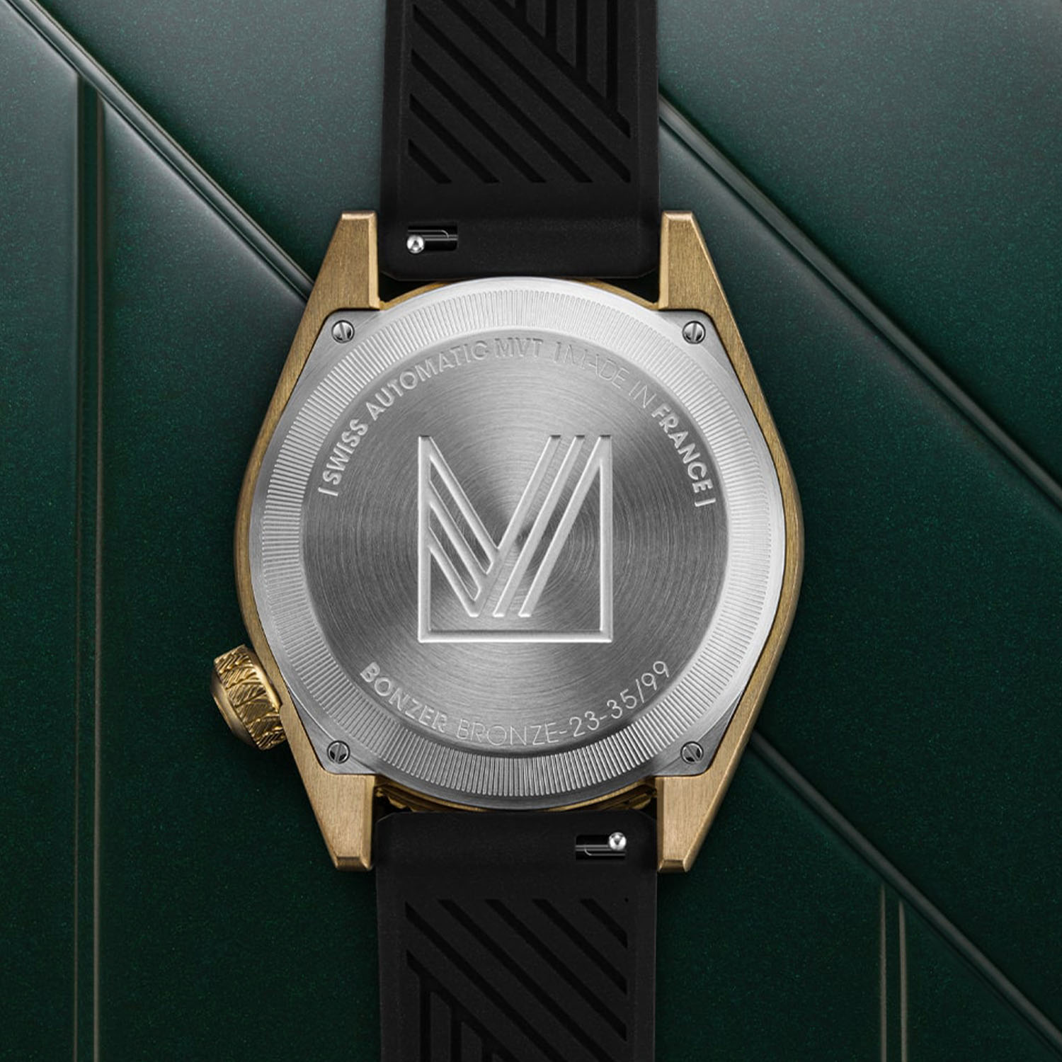 The unidirectional rotating bezel has a black ceramic insert with bronze-coloured markings and is surmounted by a domed sapphire crystal with anti-reflective treatment. With its etched retro-inspired crosshair, the black sandblasted dial has a precision minutes/seconds track on the periphery and eye-catching gold-tone metal indices inserted into the peripheral track. With their accordion-like or stepped structure, the applied chiselled indices are unlike anything you’ve encountered on a dive watch before. At noon, a metal applique represents the brand’s M-shaped logo.