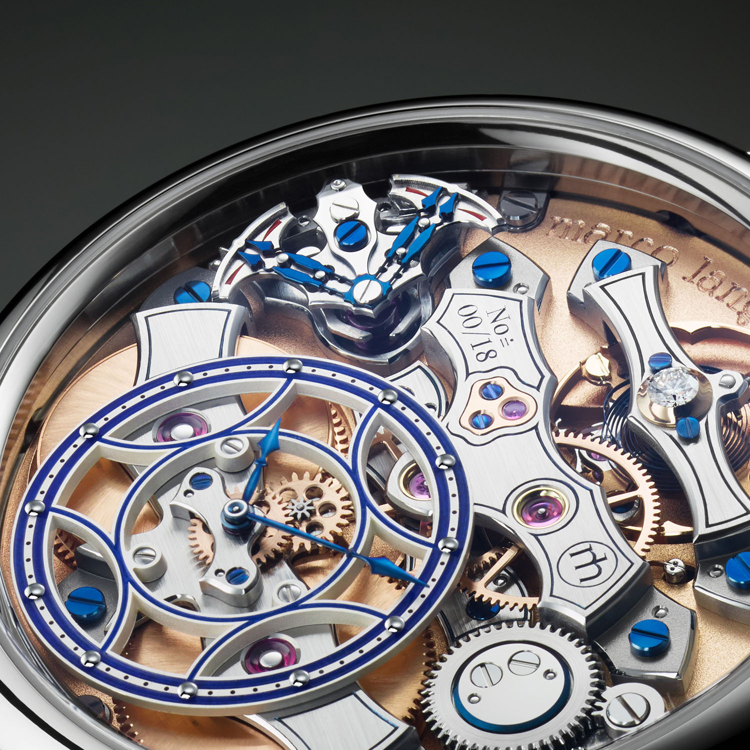 As you can imagine, the second side of the watch is mostly devoted to the movement of this Marco Lang watch. But, it isn’t there just to show off the mechanics; an additional time display has been integrated on top of the movement so there’s real practicality to this interchangeability device. Here, no more refined and discreet silver-plated dial and Roman numerals… This additional indication of the time is given by an openworked solid silver dial, filled with translucent blue “Grand Feu” enamel and blued steel cathedral hands. The back of this watch and its handmade in-house movement are, as you’d expect from Lang, an impressive display of Haute Horlogerie.