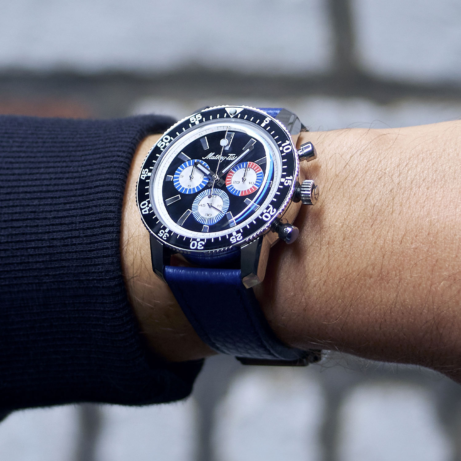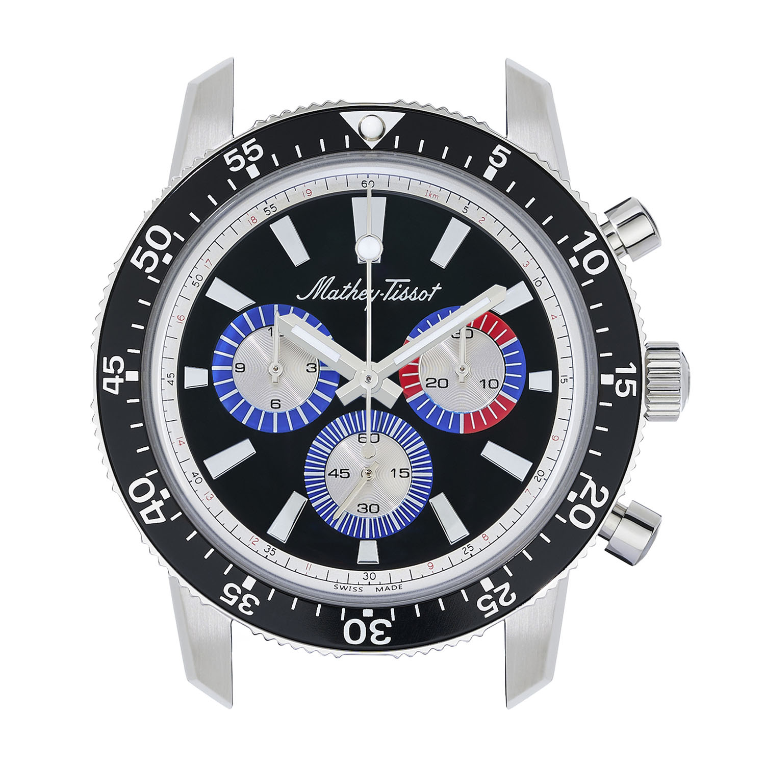 The latest team effort is the Chronograph ’68, inspired by the number of a vintage reference that was produced by Mathey-Tissot and sold in the late 1960s. Although the watch is not a 1:1 re-edition of a specific model, the case is inspired by a vintage Mathey-Tissot chronograph produced in the 1970s, powered by a Valjoux 726 with pump pushers, sharp angular lugs and a unidirectional rotating bezel. It’s worth pointing out that Mathey-Tissot has a collection called 1970 that includes several chronographs with a similar case and dial layout as this ’68 model, albeit with very few models left in stock.