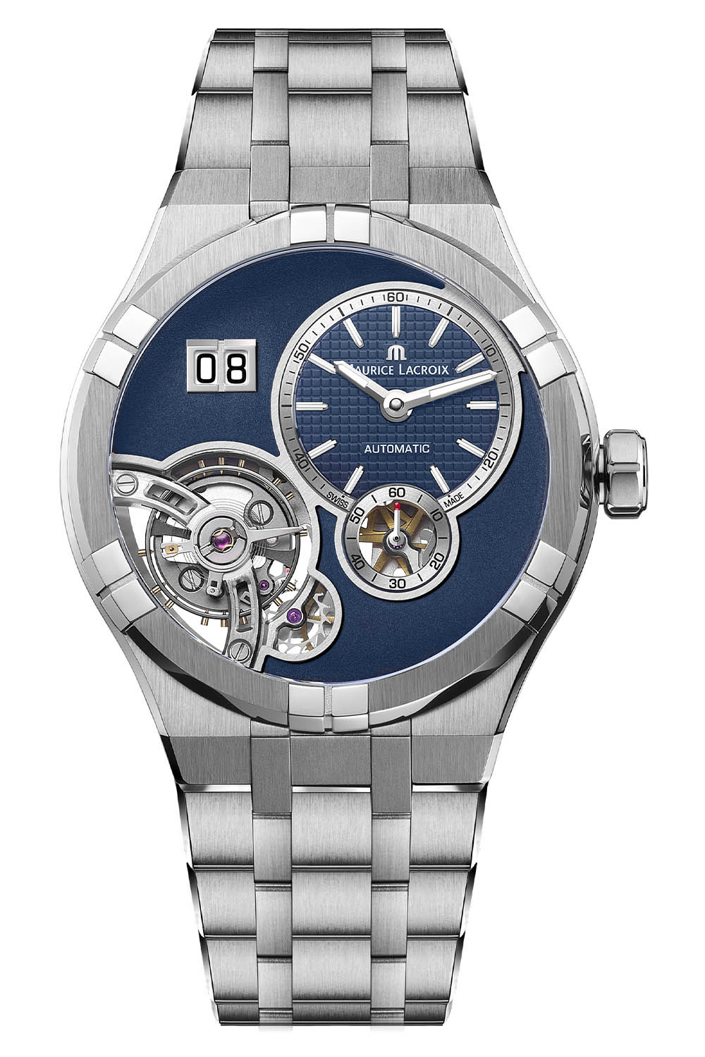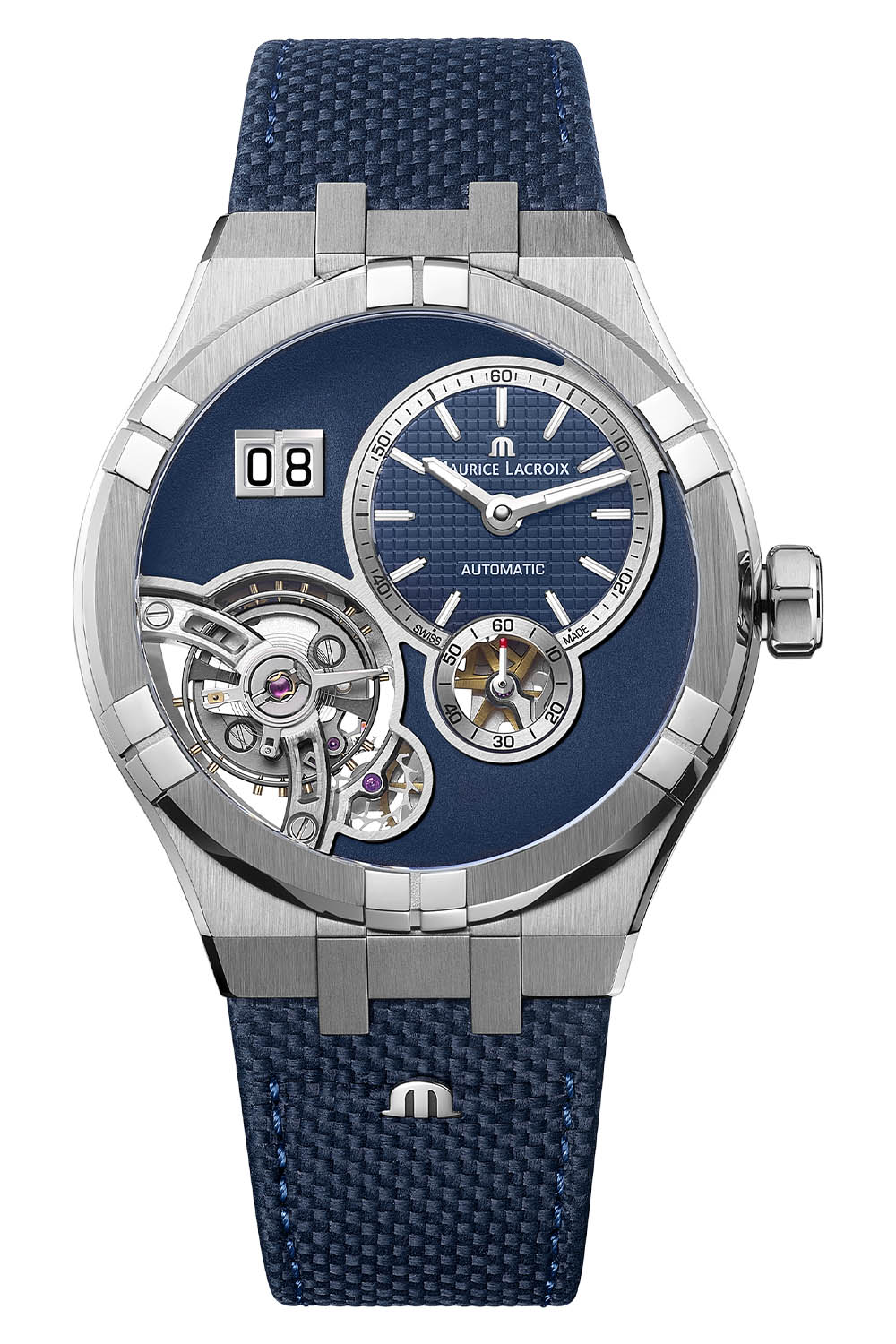 The Maurice Lacroix Aikon Master Grand Date comes on a five-row stainless steel bracelet and a dark blue Cordura textile strap secured with a steel folding clasp. The Cordura strap is emblazoned with the brand’s M logo. As with all Aikon watches, the straps and bracelets can be exchanged in seconds, with no tool required. The price is set at CHF 8,900.