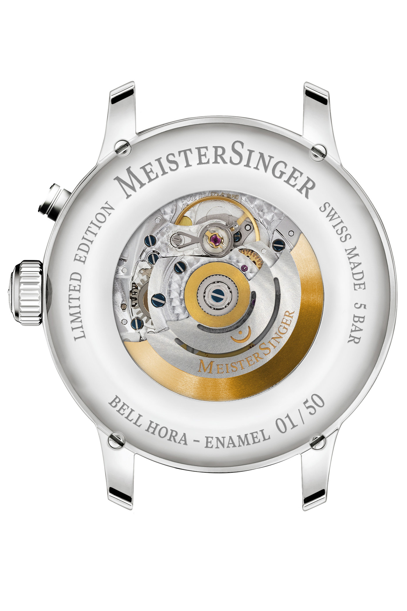 Under that lovely new enamel dial sits the familiar MS Bell movement, which uses a Sellita SW200 as a base with an in-house hour-strike module on top. The hammer and gong system is nestled between the dial and movement. It would be interesting to see if MeisterSinger can find a way to expose it without making the Bell Hora look weird (to us, the snailing dials are very much part of the watch’s attraction!). The automatic movement runs at a rate of 28,800vph and has a maximum power reserve of 38 hours. Around the back, you can see the signed rotor with a gold-coloured outer band.