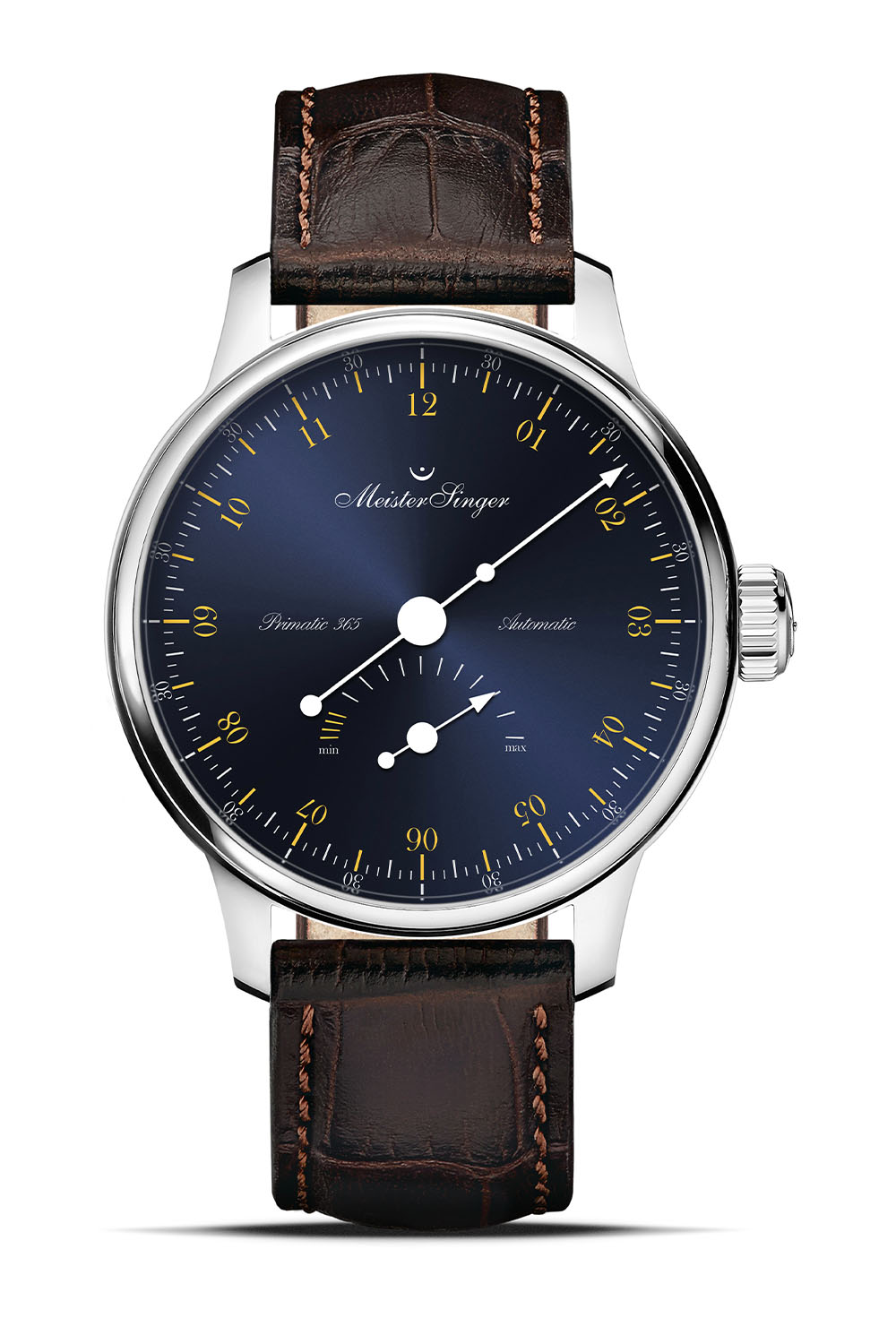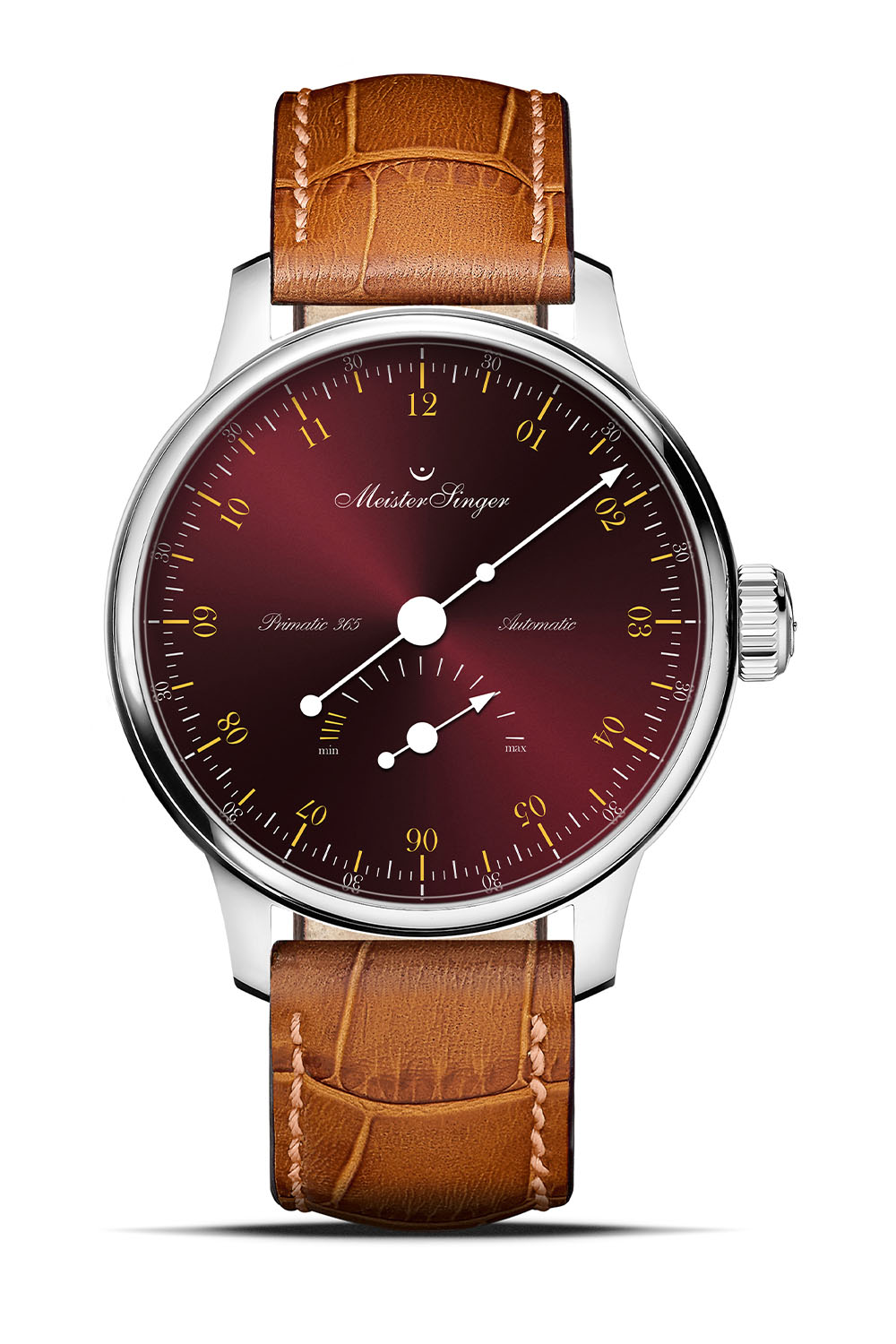 For timekeeping, the Primatic 365 watches use the Sellita-made SW270-1 movement, which operates at 28,800 vibrations/hour and provides 38 hours of power reserve. The movement´s decoration includes perlage and blued screws visible through the caseback, along with the MeisterSinger logo-shaped rotor. The MeisterSinger Primatic 365 Sunburst Bordeaux and Sunburst Steelblue are worn on a cognac or brown crocodile-embossed cowhide leather strap, closed with a pin buckle. The price is EUR 2,490; for more, please visit meistersinger.com.