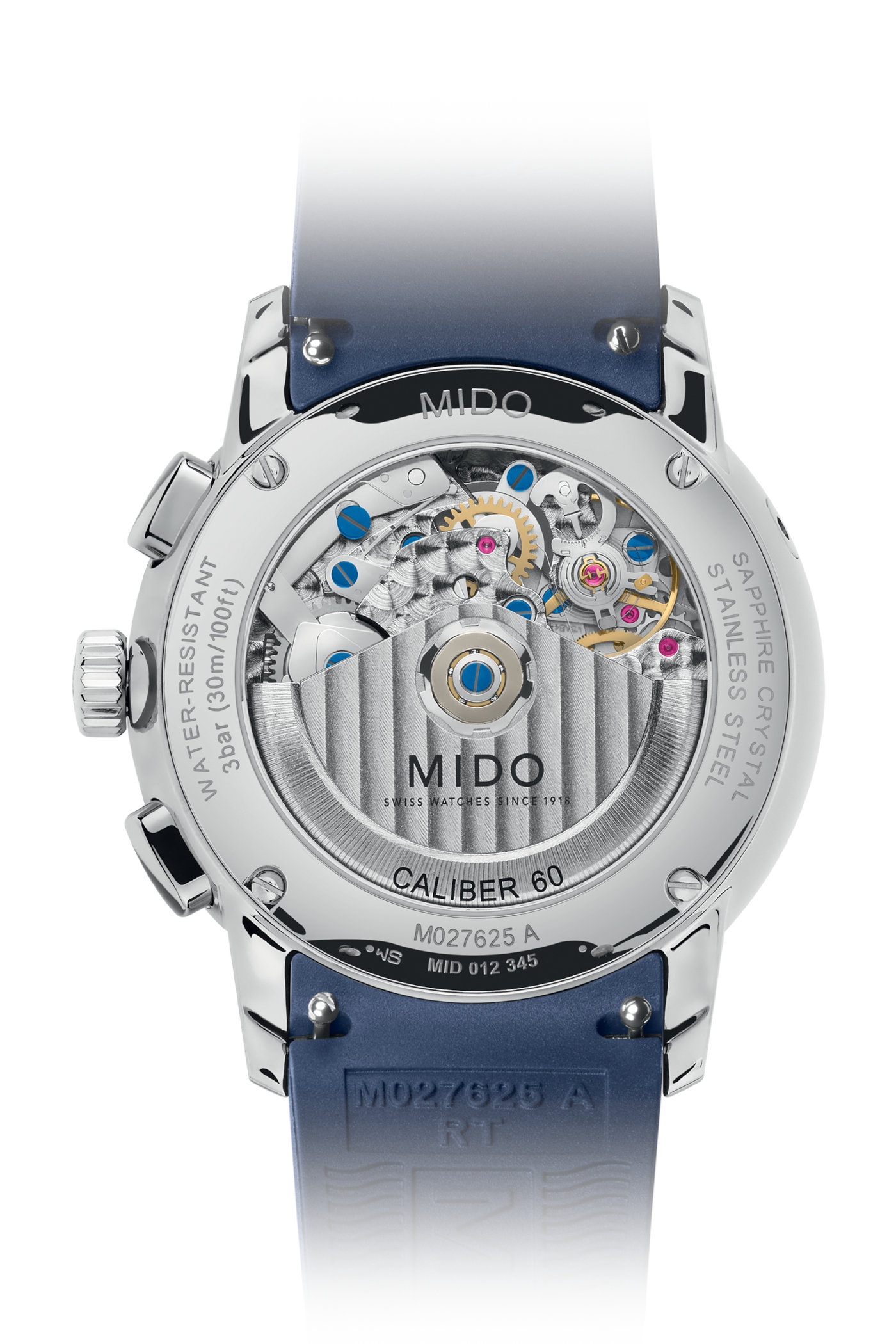 Visible under the sapphire crystal caseback is the Mido Calibre 60 automatic movement, based on the ETA A05.221. This movement shows not only the hours, minutes and small seconds but also chronograph hours, minutes and seconds as well as a complete calendar display. It runs at a rate of 28,800vph and has an anti-magnetic Nivachron hairspring. When fully wound by the central rotor, the nicely decorated movement (an elaboré grade with blued screws, perlage and Côtes de Genève) holds up to 60 hours of autonomy.