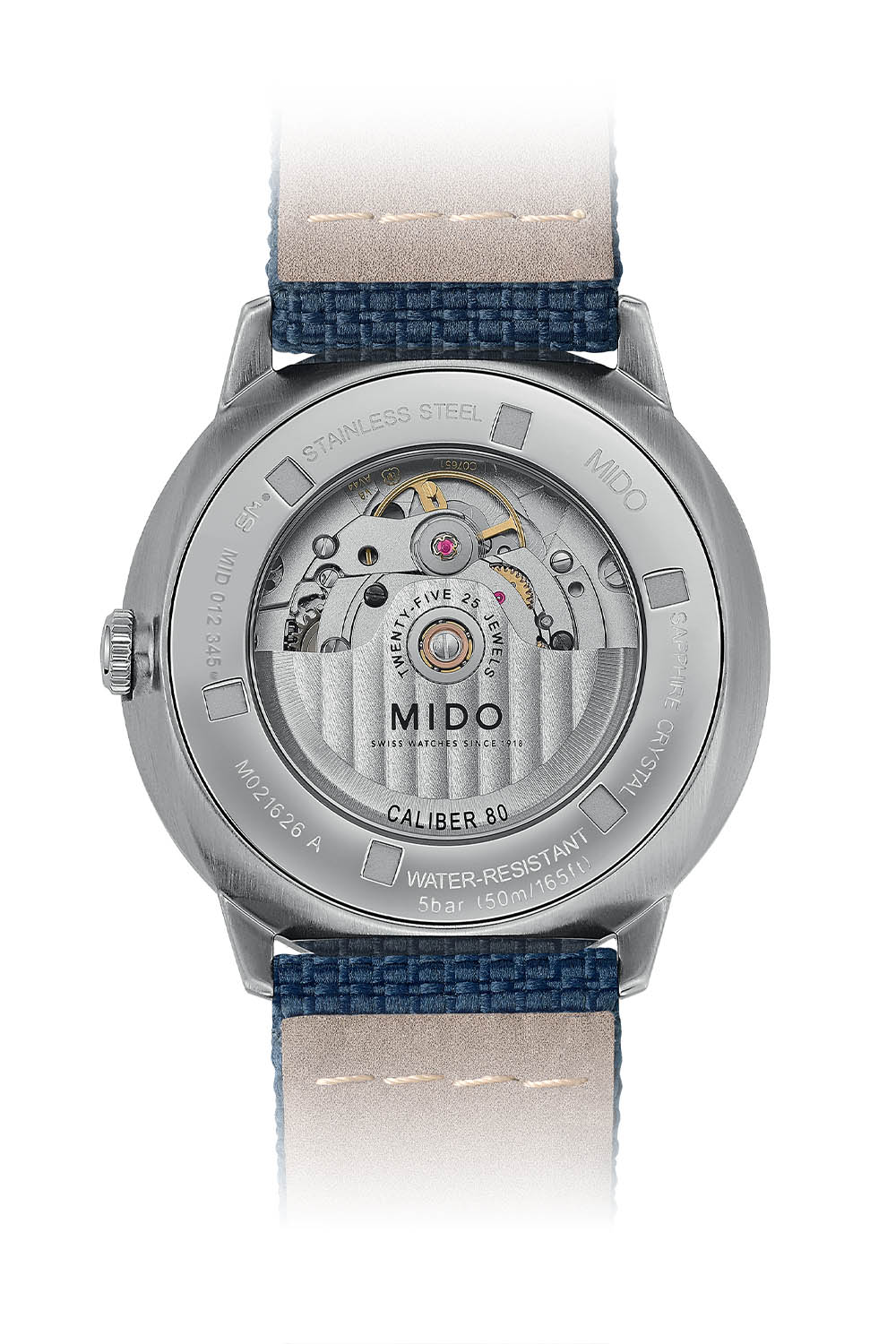 Powering the watch is the automatic Mido Caliber 80, using the Group’s Powermatic 80 base. A powerful engine, it boasts 80 hours of power reserve and uses a Nivachron hairspring, known for its anti-magnetic properties. Running at a frequency of 3Hz, it is here presented in an élaboré grade, adjusted in 3 positions and decorated with Geneva stripes.