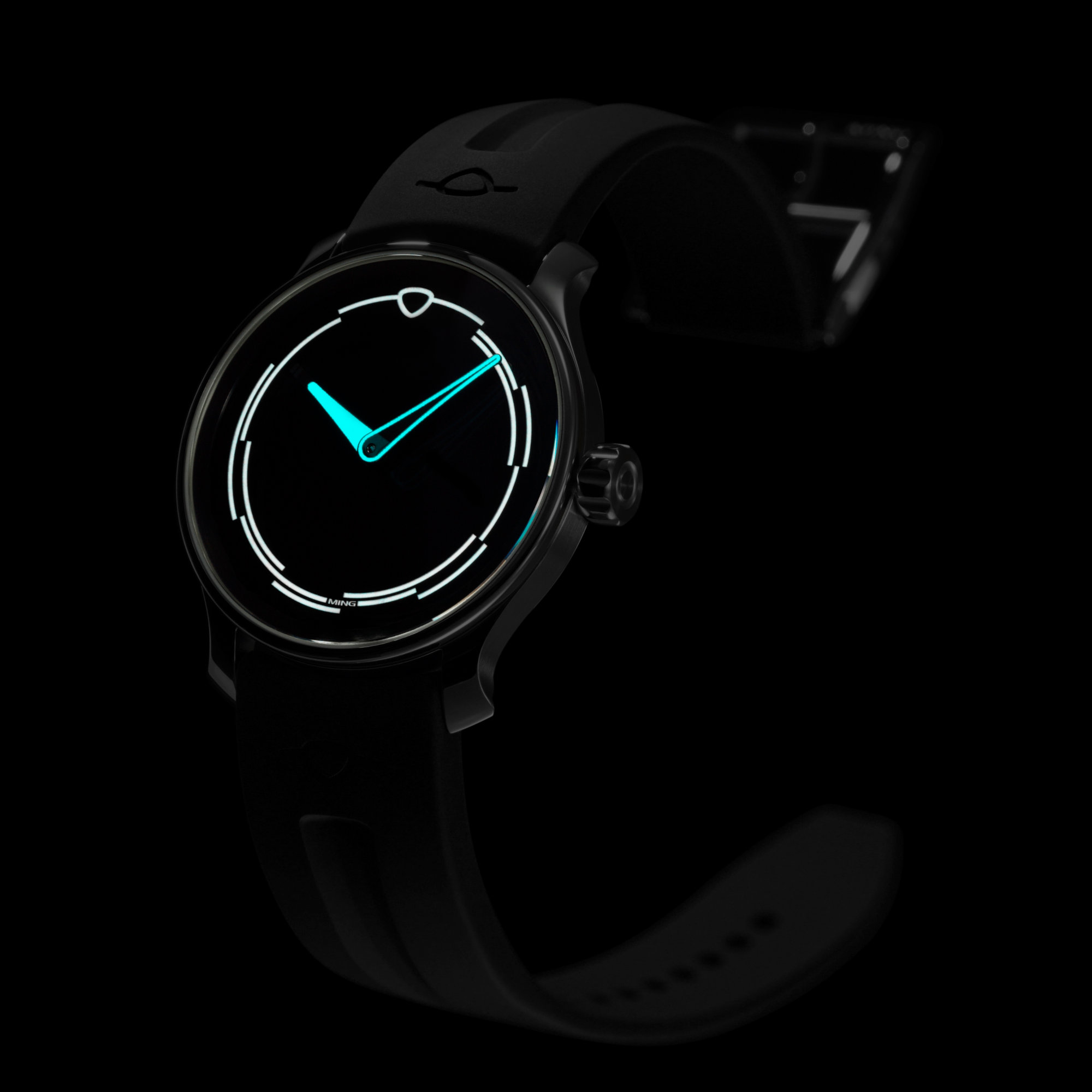 With most MINGs, it’s all about the interplay of light and shadow, and the MING 37.02 Minimalist delivers as expected despite its cleanliness. The sapphire crystal dial has a special inset of liquid-filled Polar White luminous indices. The two hands are finished with blue-emitting Super-LumiNova X1 inserts and indicate the hours and minutes only. The only form of branding is the subtle mention of “MING” at 6′, keeping the minimalist theme going.