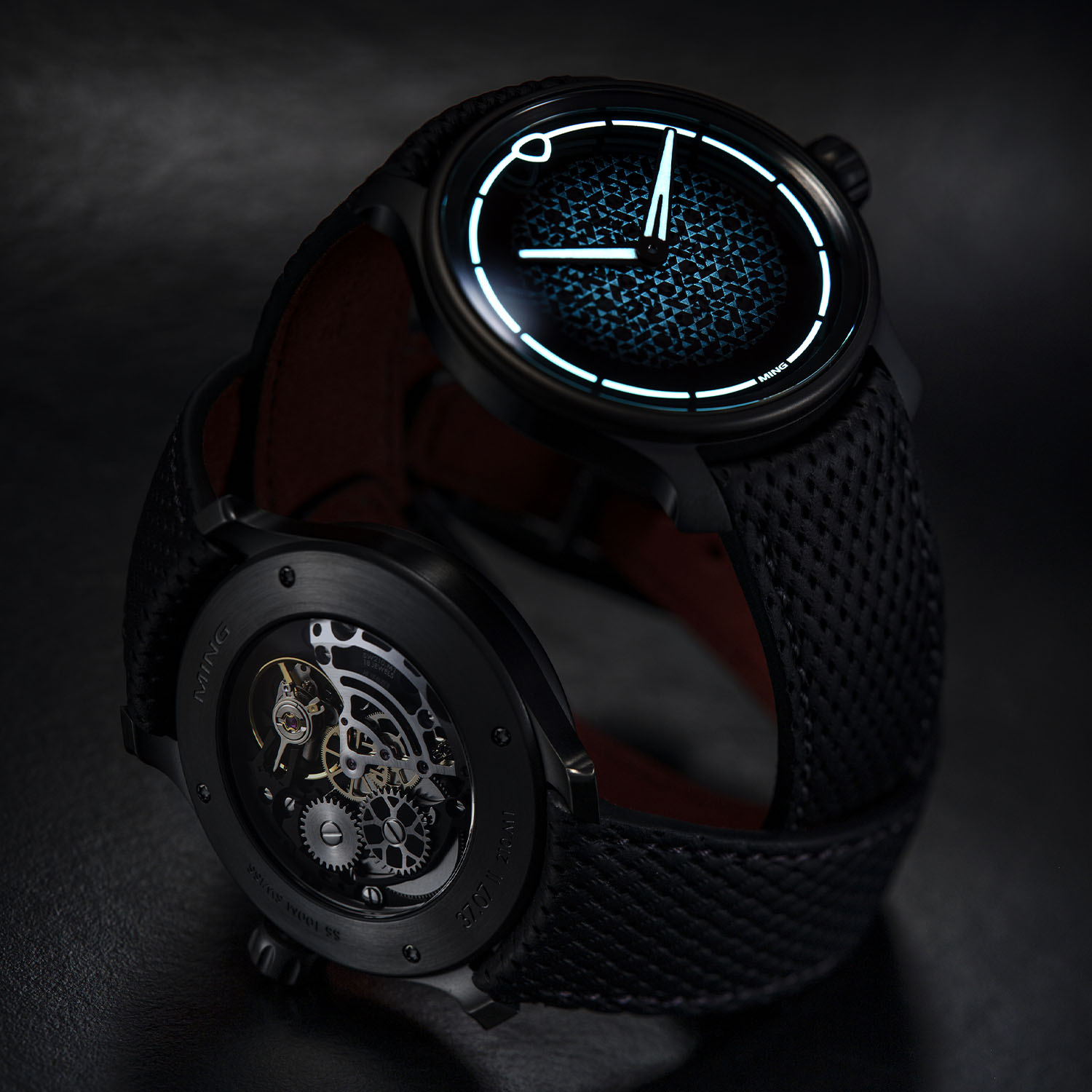 Ming’s 37.07 returns in a dark black DLC case with a more subtle grey luminous mosaic dial.