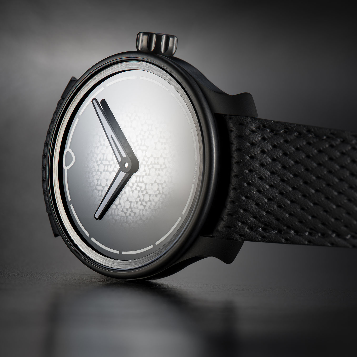 Although the dial shares the mosaic pattern featured on last year’s anniversary model, it too has succumbed to a darker mood. The gradient mosaic pattern, first reproduced by laser on the sapphire dial of the 20.11 Mosaic watch, proved popular but was too expensive to replicate in more accessibly priced models. Ming found a way around the issue by using a Super-LumiNova-coated brass base dial with a sapphire crystal on top printed with a mosaic pattern.