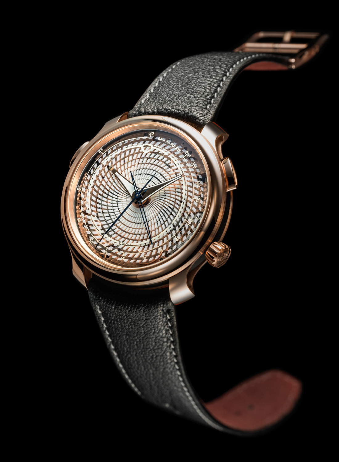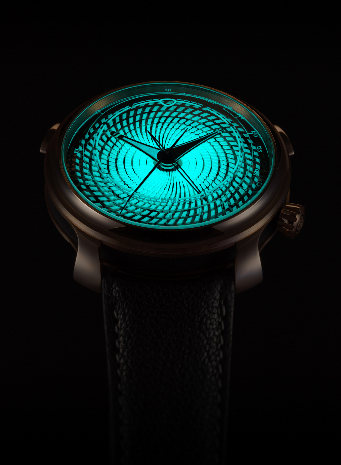 The dial is made of borosilicate (borosilicate glass is what most expensive food containers are made of, exploiting the non-toxic nature, durability, chemical resistance, and thermal stability of the material) using a high-energy laser in the process with 600 cavities arranged in a circular vortex-like pattern, which are hand-filled with a Super-LumiNova X1 mix. The inner surface of the sapphire crystal is etched with luminous hour indices and a minute track, accompanied by a pulsometer scale near the edge. The centrally mounted luminous hands for hours and minutes and two chronograph hands for the elapsed minutes (jumps instantaneously) and seconds adhere to MING’s distinctive aesthetic, standing out clearly against the unique backdrop of the dial.