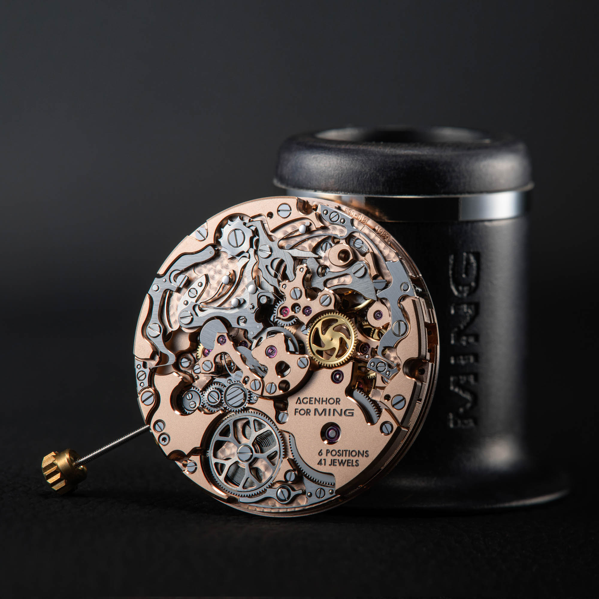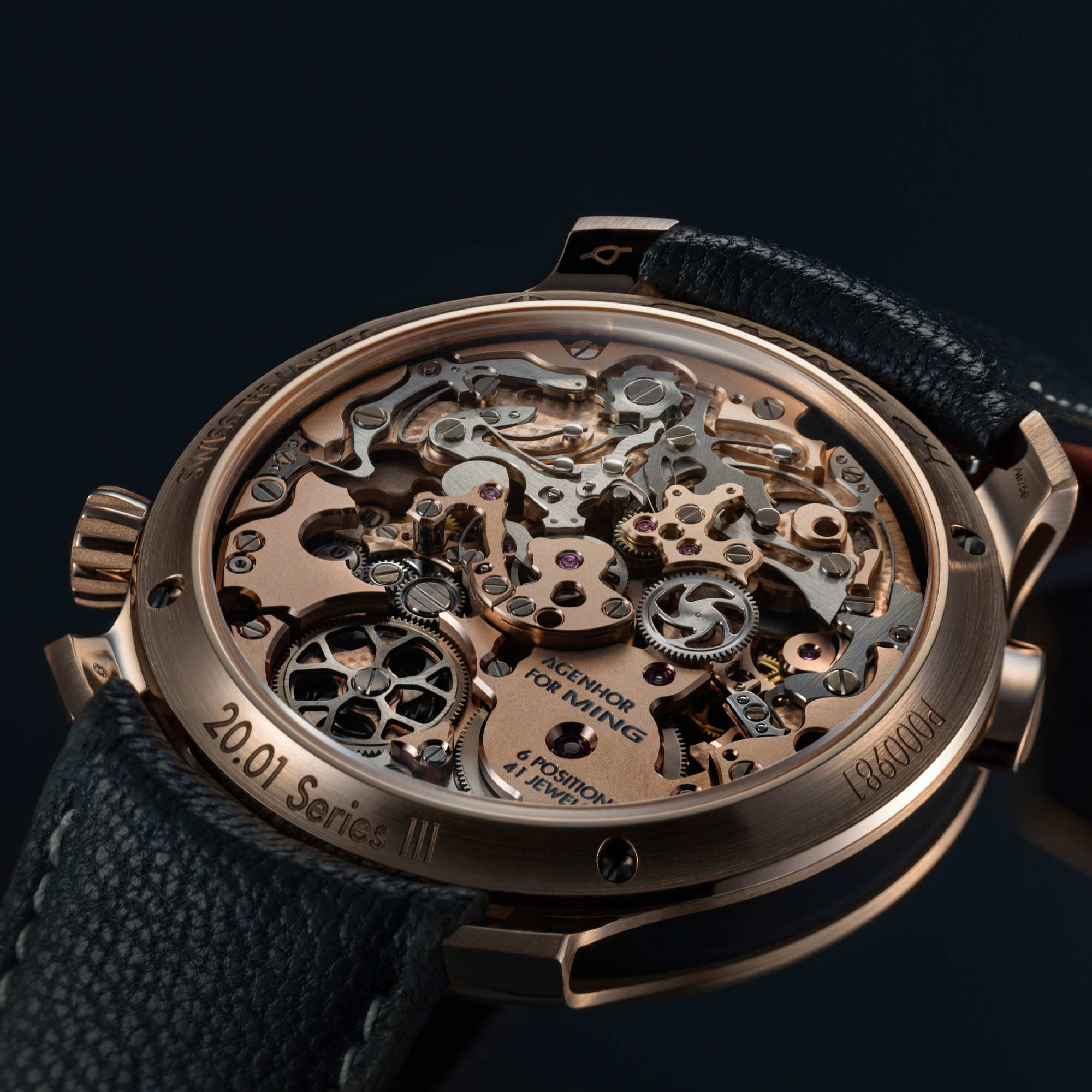 The new MING 20.01 Series 3 is powered by the same Agenhor-designed Agengraphe Cal. 6361.M1, as found in the 20.01 Series 2, with a fresh finish featuring rose-gold-coated plates and bridges, visible through the sapphire caseback. This manual-wind movement is a more streamlined version of the original Agengraphe with three central chronograph hands and two peripheral hands for the time. A similar approach, with just the four hands mounted on the centre axis – a minute hand, an hour hand, and two additional chronograph hands for the seconds and minutes, was used by H. Moser & Cie. for its Streamliner Flyback Chronograph. In that case, the HMC 902 calibre, also developed by Agenhor, retained its automatic winding mechanism. The MING 20.01 Series 3 calibre 6361.M1 offers a power reserve of 55 hours, and the movement, which includes Agenhor’s proprietary coupling mechanism, regulator, and upgraded clutch, is adjusted to six positions.
