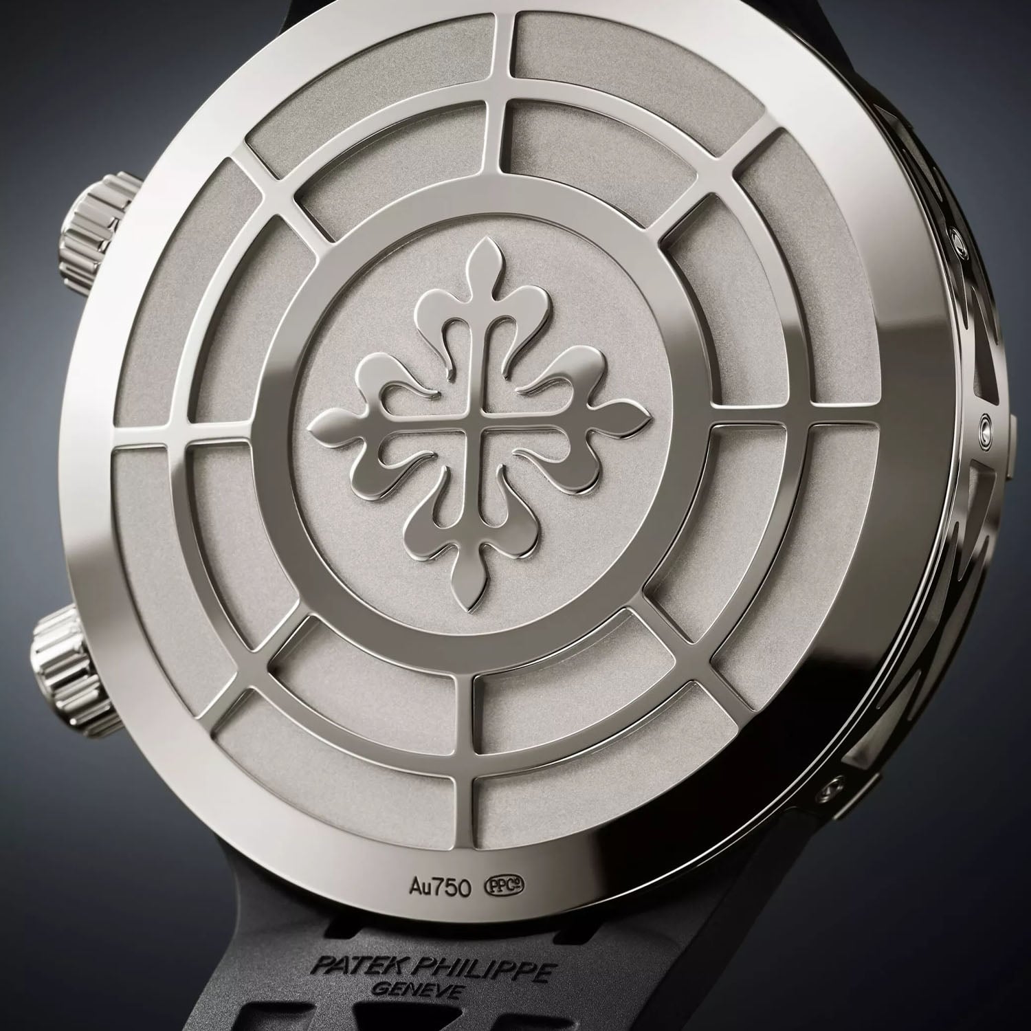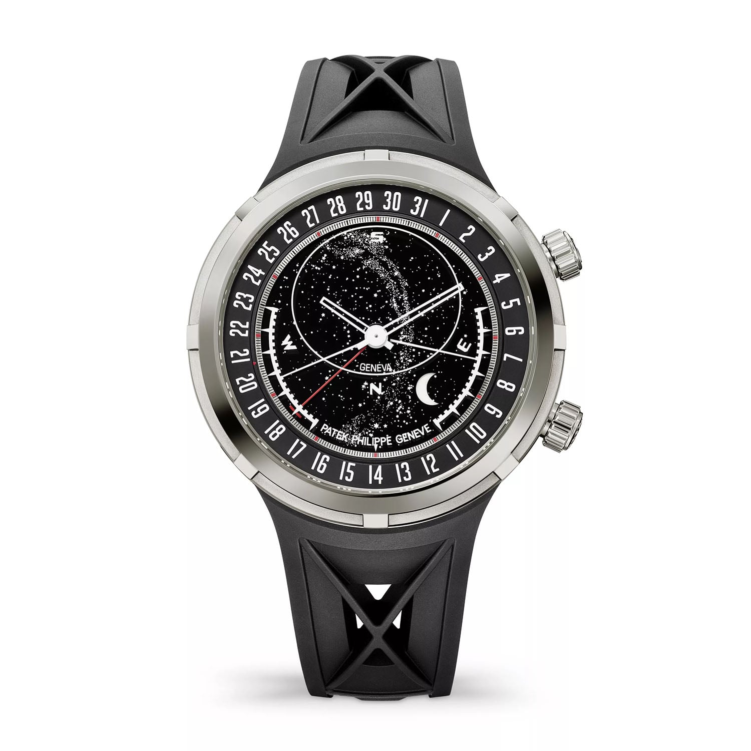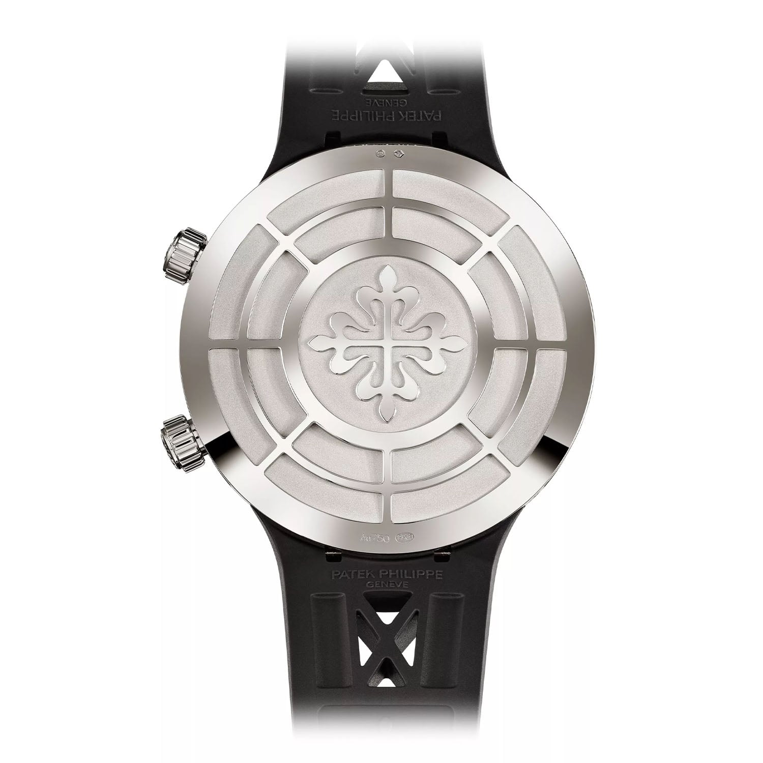 The Patek Philippe 6105G comes on an integrated black composite strap with an X decor echoing that of the case. It is secured to the wrist by a triple folding clasp. Price is CHF 350,000.