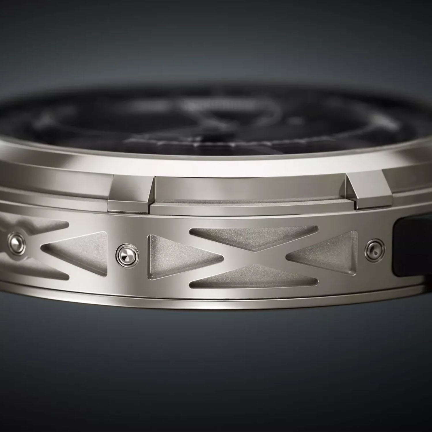 Just like for the Celestial, the 6105G features a multi-layered dial with several stacked discs that rotate independently to display the night sky with the apparent movement of the stars as seen from Geneva, together with the phases and orbit of the Moon. One disc in sapphire for the mobile sky chart rotating in 23 hours and 56 minutes. It features the star chart on the front side and the Milky Way on the back to enhance the sense of depth. A second disc in sapphire, covered in black PVD and mounted on an aluminium wheel, represents the rotation of the moon in 24 hours and 50 minutes. It features a round opening to reveal a third disc, in mineral crystal, to reproduce the moon phases. This mechanism deviates by just one day in 3000 years.