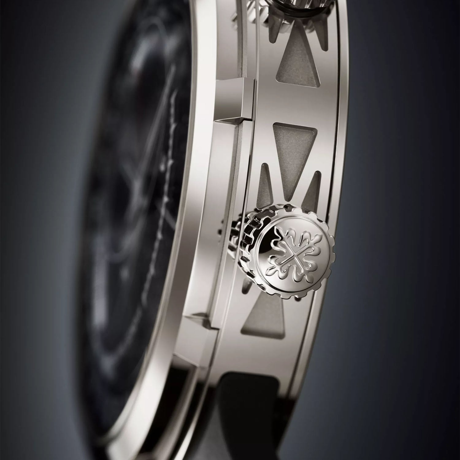 This marvel of watchmaking ingenuity is housed in a 47mm white gold case whose design is surprisingly modern for a Patek Philippe. It features a lugless design, making the watch appear smaller on the wrist than its actual diameter suggests. The case band and the solid case back (quite unique for a Patek Philippe) are decorated with a modern X-shaped decor. The two crowns at 4 and 2 o’clock are used respectively to wind and set the time and to set the astronomical indications. A patent system to position the stems allows their perfect integration into the case profile and decor. Lastly, a pusher set into the case band at 7:30 permits date adjustment via consecutive actuations.