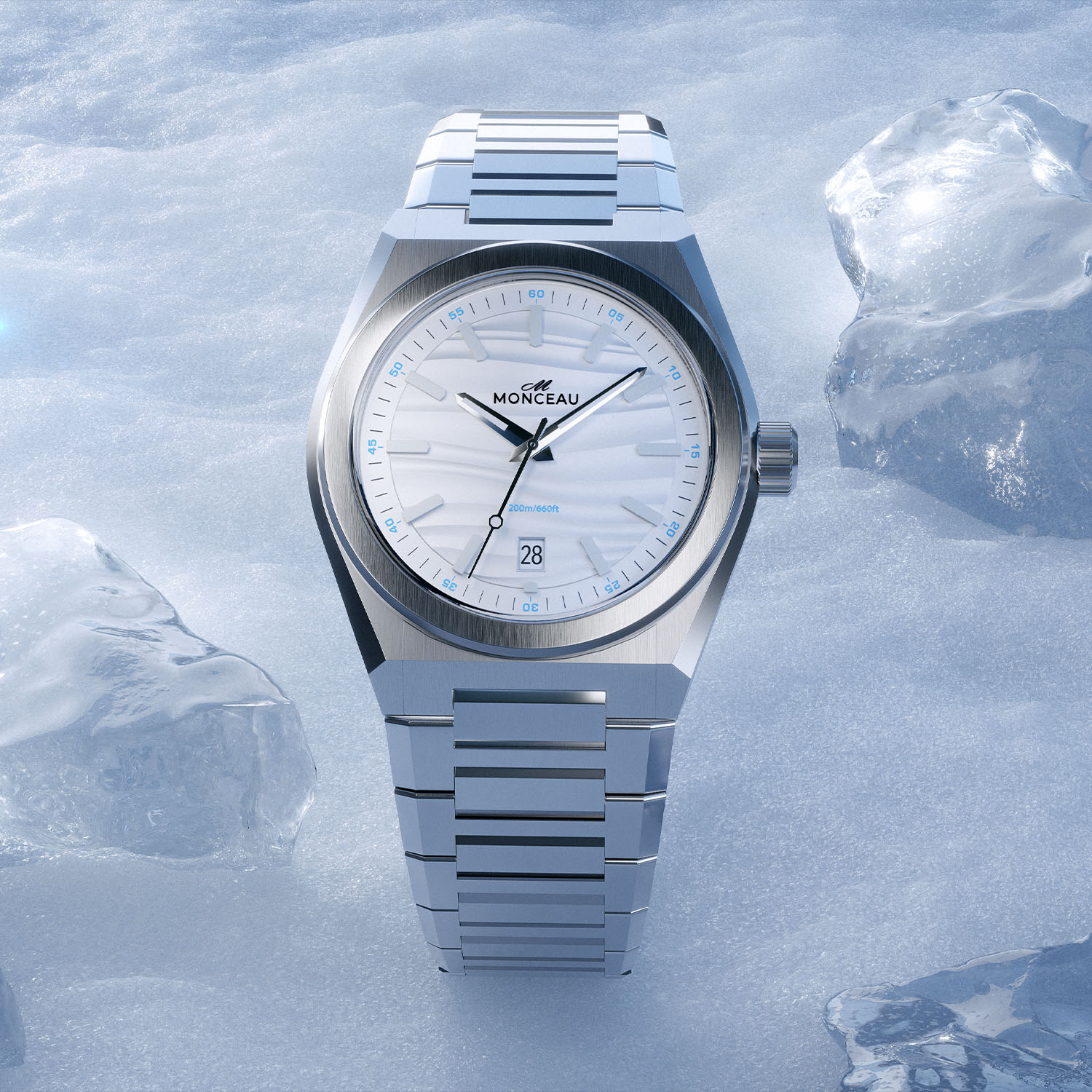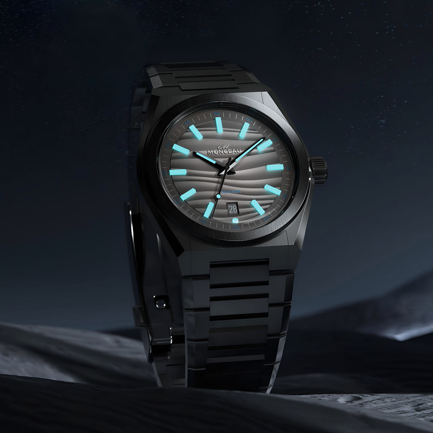 The dial comes in four different options, which are split into two duos. All feature the same rippled texture, which is inspired by the red dunes of Riyadh, the black volcanic sand at the base of Reynisfjara in Iceland, and the frozen landscapes of the Antarctic. The difference comes from being solid in colour for the Icelandic Black and Antarctic White dials, or fumé Atacama Grey or Riyadh Red for the other two. These are then finished with applied solid blocks of luminescent material, paired with central hour, minute and seconds hands, filled with Super-LumiNova inserts. At the bottom, there’s a traditionally placed date window with a framed and bevelled rectangular outline.