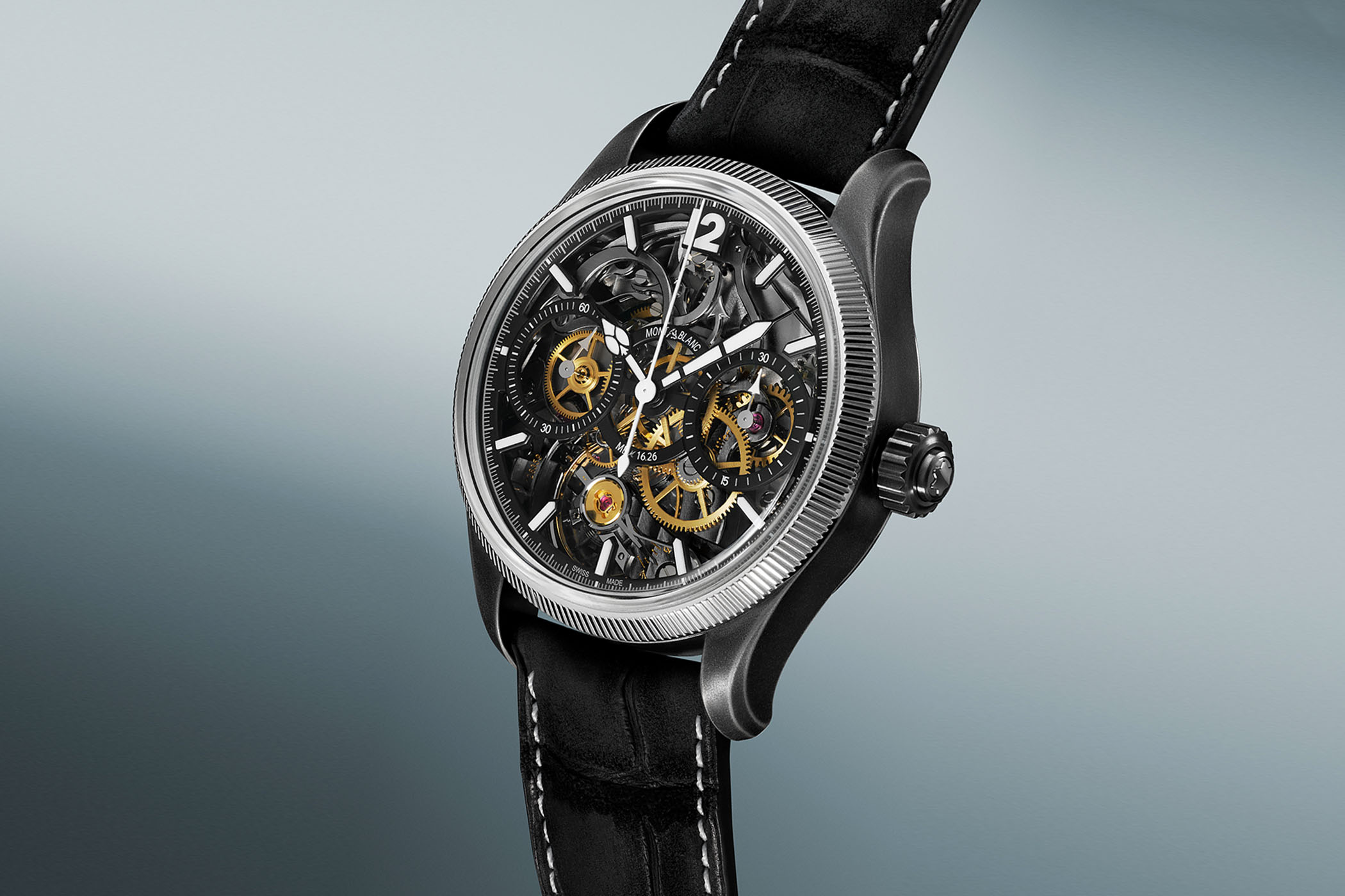 The distressed steel finish of the 43mm diameter x 14.8mm case is a three-fold process. First, the case is given a black coating and then washed and brushed by hand using quartzite to produce an individual patina before finally being brushed and polished. As a nod to Minerva’s first fluted bezel of 1927, the latest iteration comes with a white gold fluted bezel.