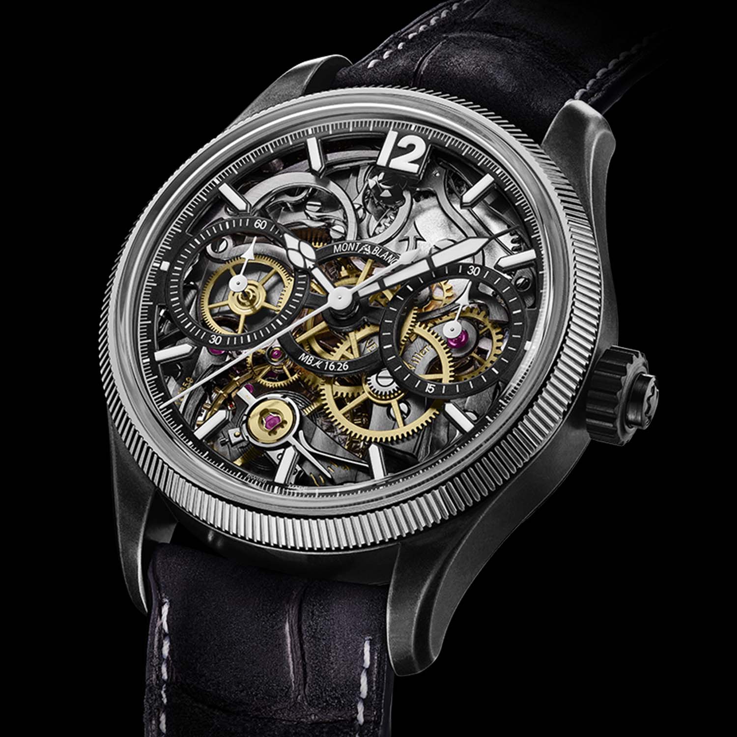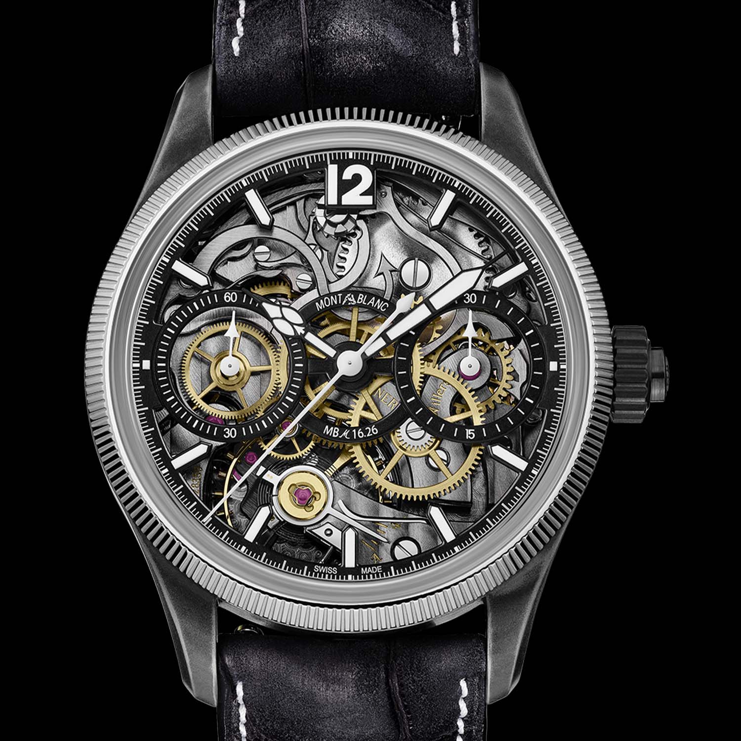 So as not to distract from the movement, the 30-minute chronograph counter and small seconds are relayed on two black openworked rings flanking a central ring with the Montblanc logo and the calibre reference. Beady-eyed readers will notice that the calibre printed on the central ring reads MB M16.26, although the calibre is the classic Minerva M 16.29. An in-house joke, the inversion of the 9 to become a 6 refers to the inverted movement. The hour indices on the flange are suspended above the movement and treated with Super-LumiNova, like the cathedral-style hour and minute hands and the central chronograph seconds.