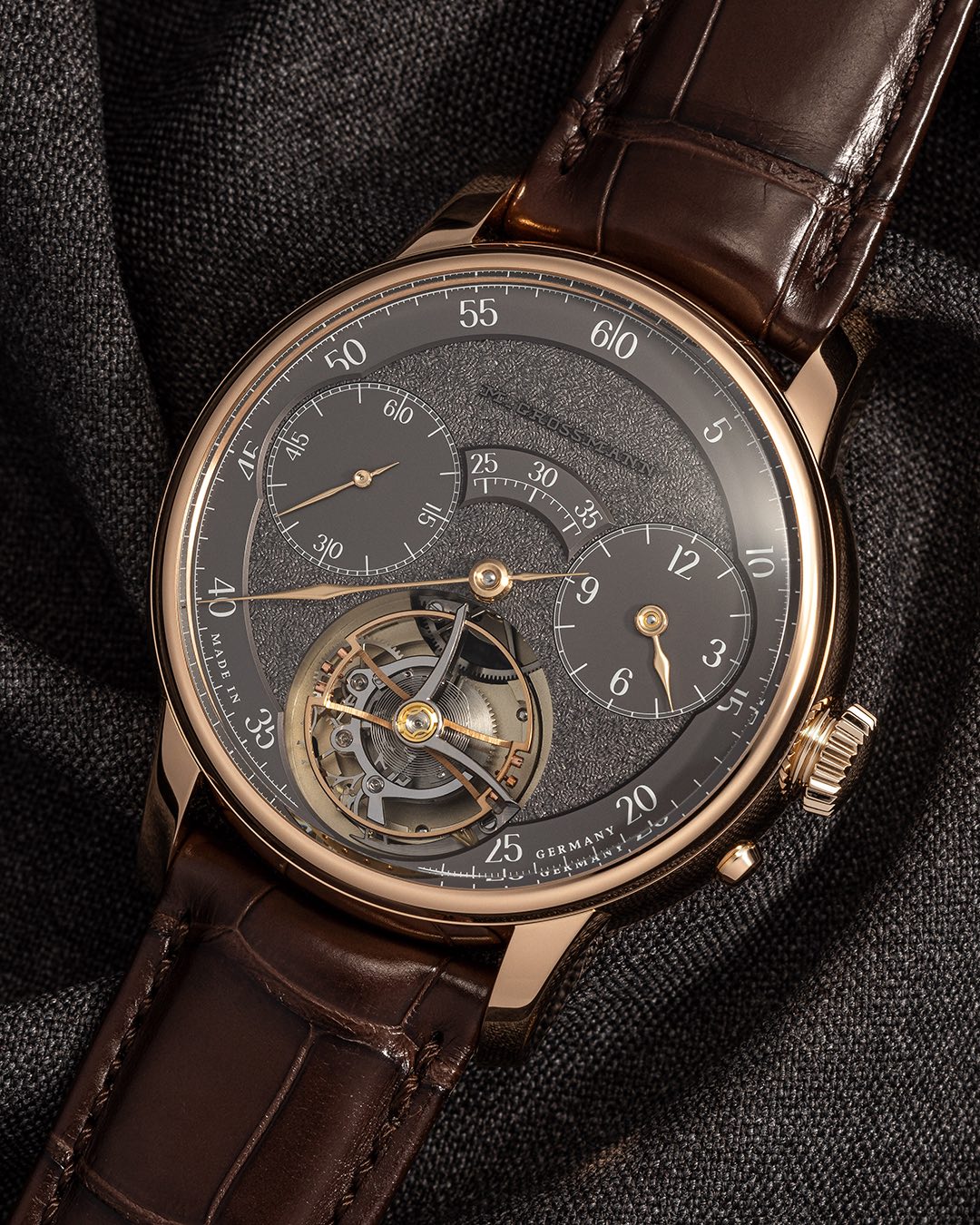 As for the display, the Moritz Grossmann Tourbillon is quite unique, being a regulator with central minutes and sub-dials for the hours and the seconds. Due to the large size of the tourbillon cage – 16mm – these two indications are slightly offset to the top of the dial. While each hand is designed to once again enhance legibility, the central minute requires a bit more explanation. As the minute display is interrupted by the aperture for the tourbillon in the lower half of the dial, the minute hand has been extended beyond the centre. This counterweight now precisely presents minutes 25 to 35 on a scale (for the records, a patented solution…)