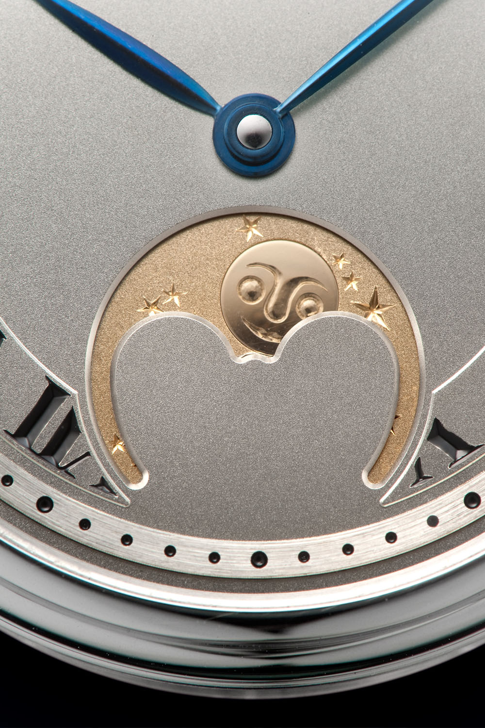 The gold colour of the moon phase disc strongly contrasts with the matte finish of the German Silver dial. The dial is about three times thicker than usual to give room for the hand-engraved roman numerals. Each one is engraved by hand into the dial disc. After the engraving, the dial is cleaned up and the engravings are filled with a synthetic “cashew” Japanese lacquer. The glossy finish of the recessed numerals gives the dial a real sense of depth, especially paired with the stepped design. On the outer edge of the dial is a machined minute track with recessed dots on a circular brushed ring. This minute track is a separate component in the dial construction.