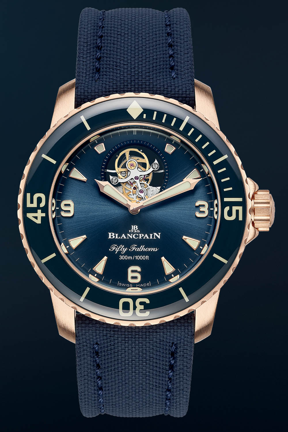 However, the main design tweaks can be clearly appreciated on the dial and bezel that are now blue. The 60-minute unidirectional domed sapphire bezel is hallmark Fifty Fathoms and displays the classic diamond at noon, the all-important 15-minute scale and large Arabic numerals at 15, 30 and 45. The dial is also blue with a lovely sunburst effect that attracts the light. Comparing the earlier edition (still in catalogue) and the new models, another big change is the removal of the power reserve indicator and the rearrangement of the inscriptions that are now neatly placed in the area originally dedicated to the indicator, just above 6 o’clock. By removing the power reserve indicator, the dial looks cleaner and less cluttered, allowing the eye to concentrate on the spectacle of the flying tourbillon at noon.