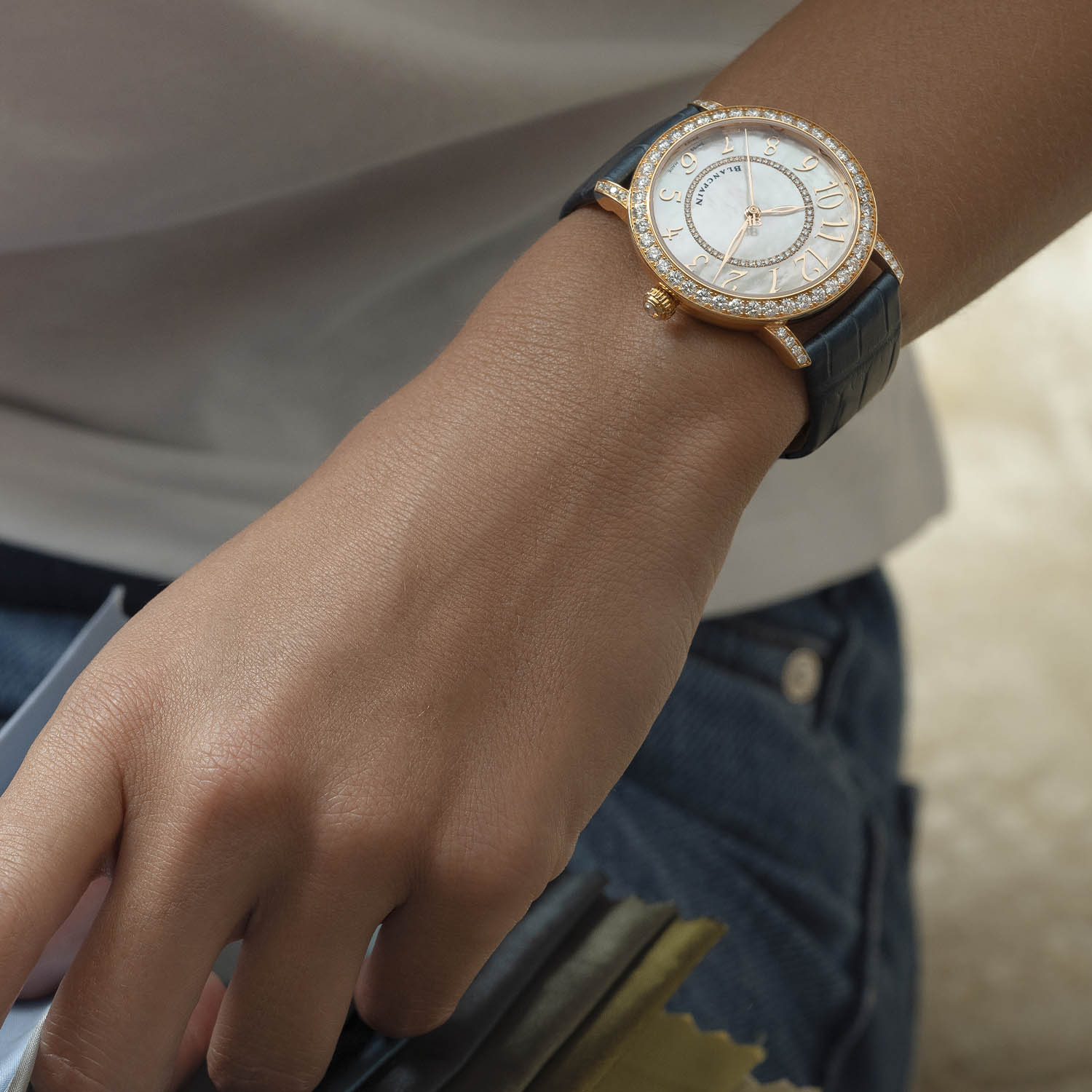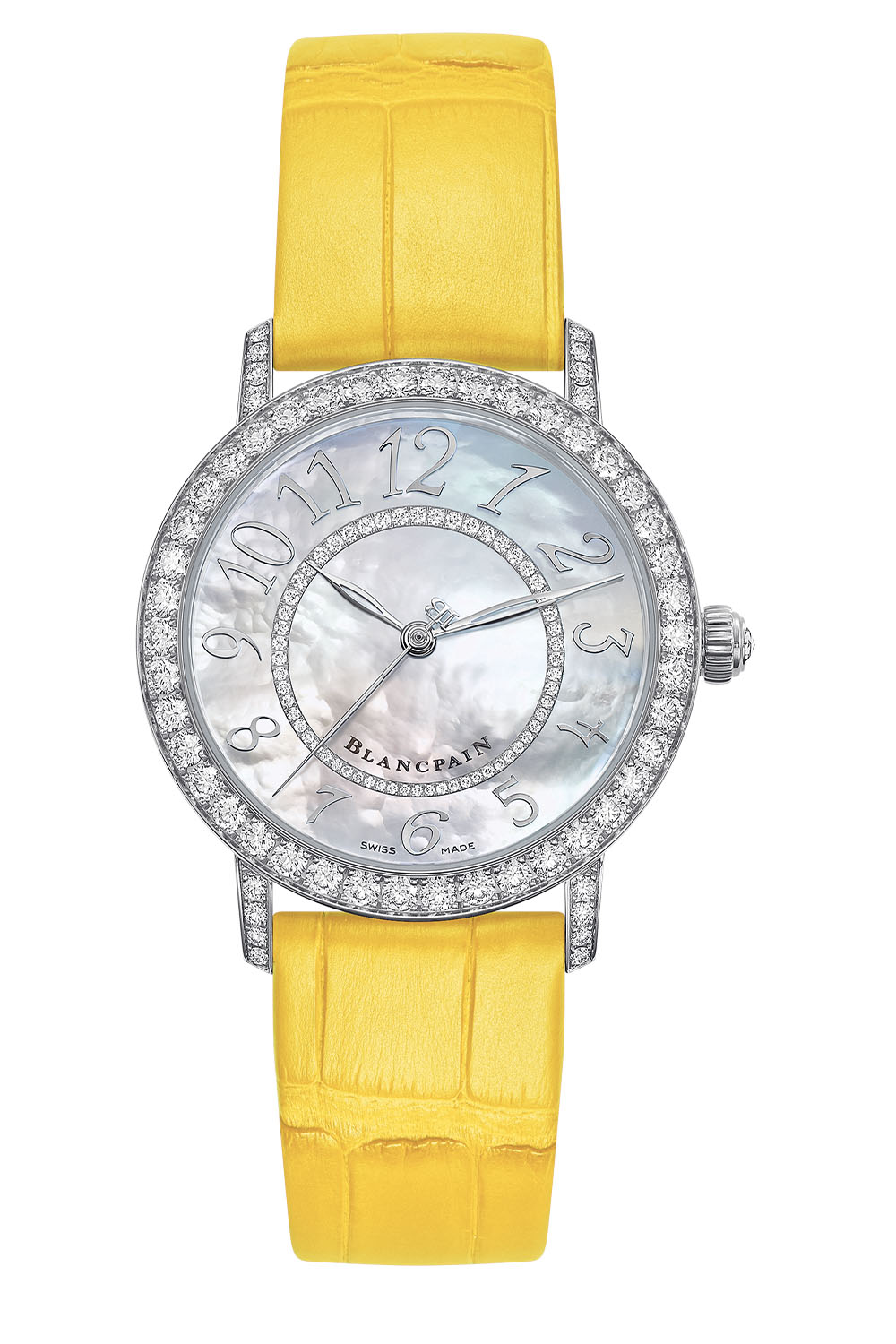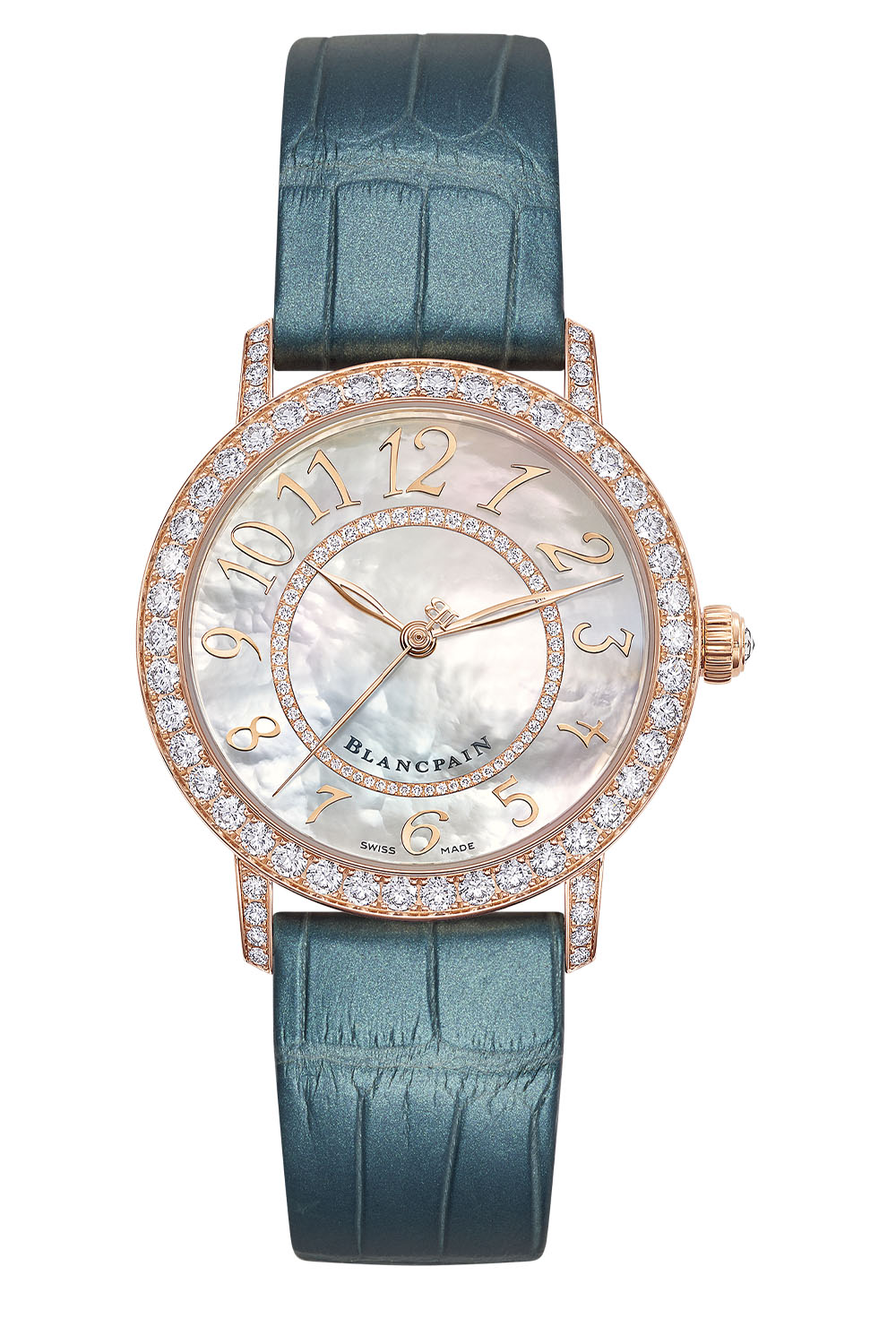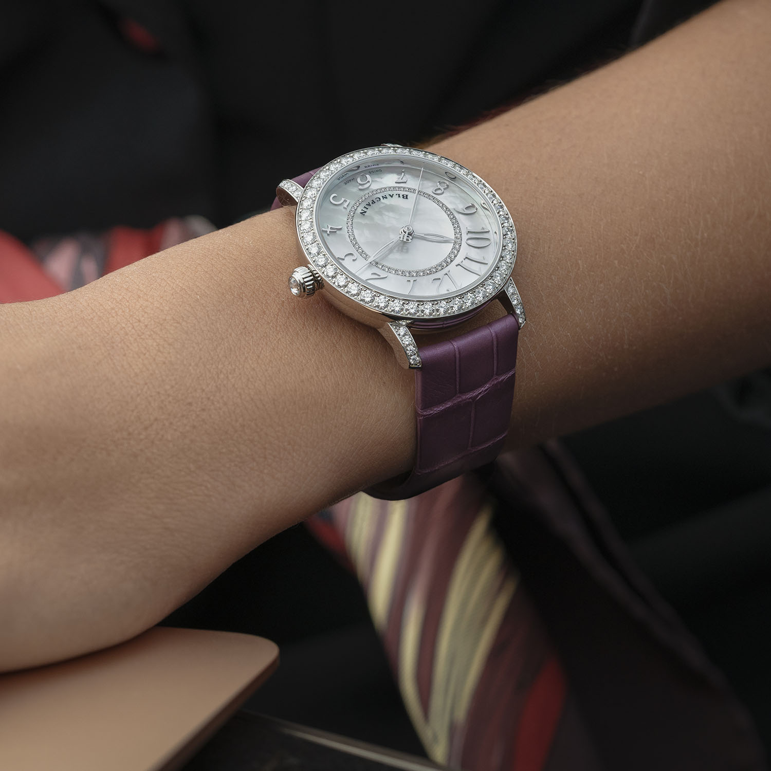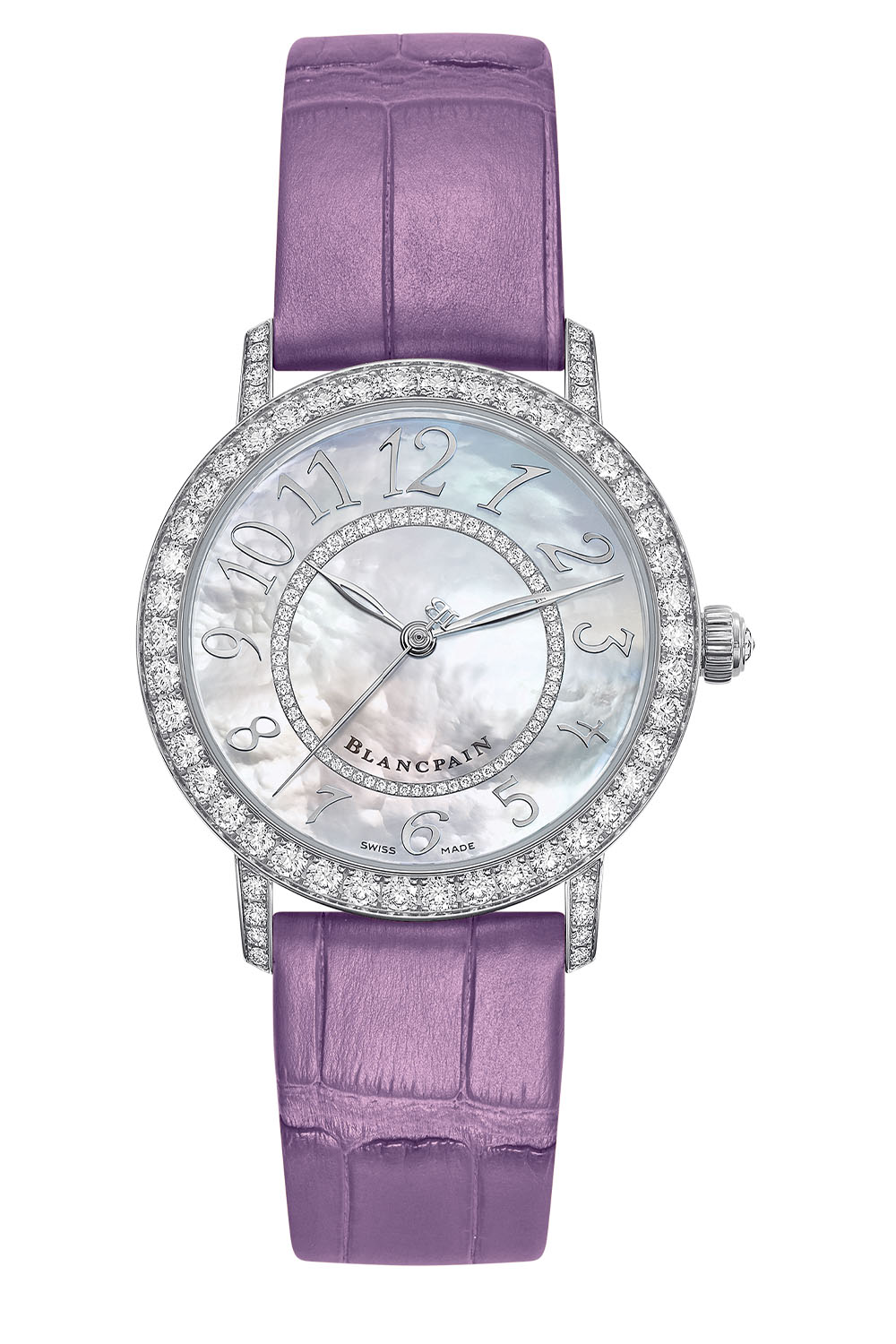 The natural iridescence of white mother-of-pearl on the dial provides an ever-changing background, depending on the light. Applied directly to the mother-of-pearl, twelve slanting Arabic numerals surround a central ring set with smaller diamonds. The characteristic hollowed sage leaf hour and minute hands of Blancpain are accompanied by a thin central seconds hand with a JB counterweight (a reference to the initials of the founder).