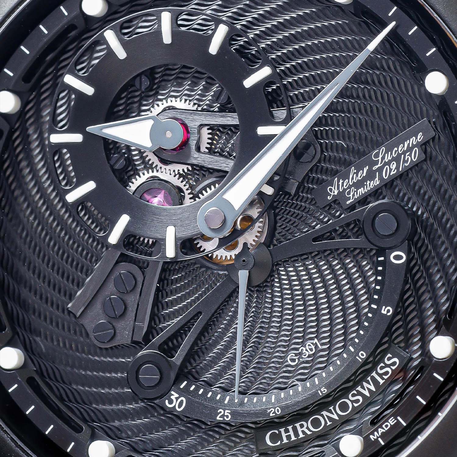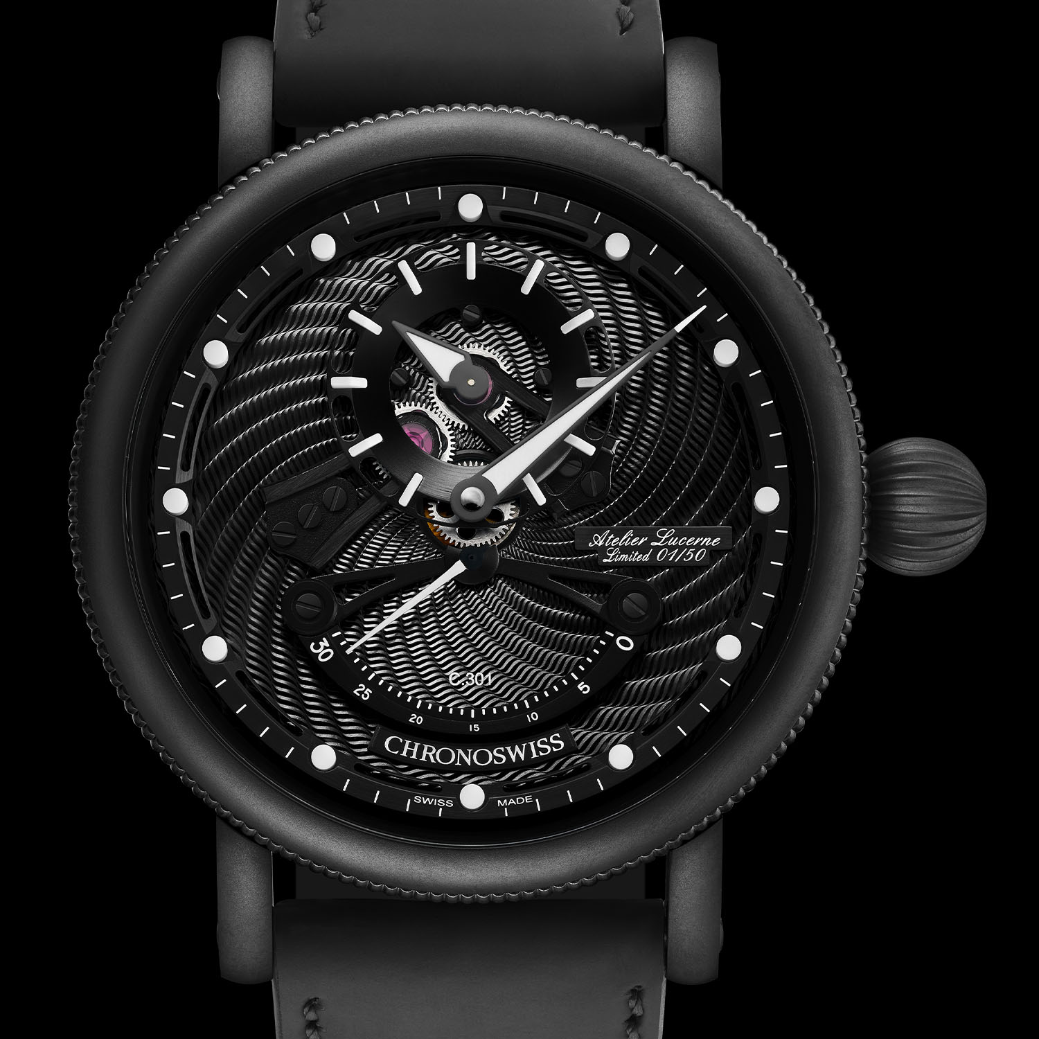 The effect is achieved by an array of decorating techniques applied to the 44mm black DLC-coated case, consisting of 17 parts and the 42-part two-level dial. The case is satin finished, with a matte sandblasted partially knurled bezel and the characteristic onion crown. The dome of the curved anti-reflective sapphire crystal lets you into the eye of the storm, the dial, where white elements – the outer minute track, the indices and the Super-LumiNova inlays of the hands – seem to stand firm against the whirlwind that rises from the black-coated bottom level, with its guilloché pattern created by hand using a century-old rose-engine turning machine found in the Chronoswiss workshops. The off-centred hours ring appears suspended in mid-air. The retrograde seconds hand at 6 o’clock – which travels 120° before jumping back to 0 every 30 seconds – adds a chaotic feel to Hurricane image.