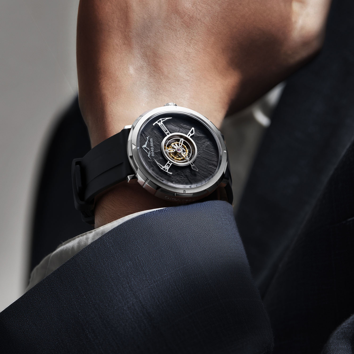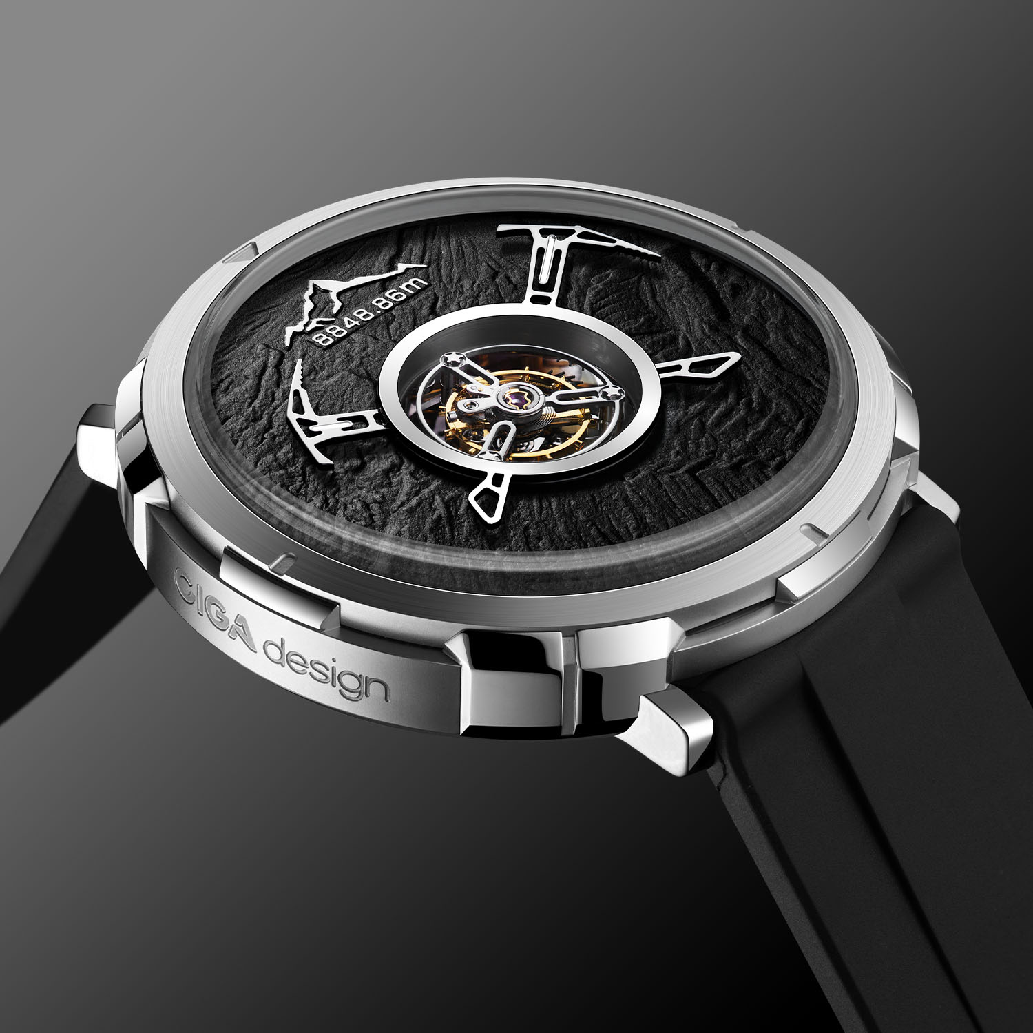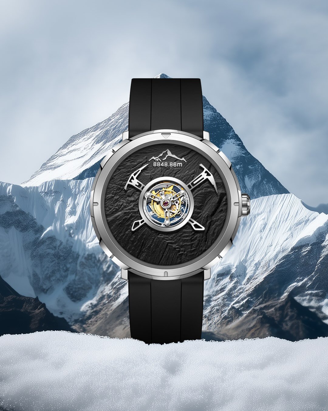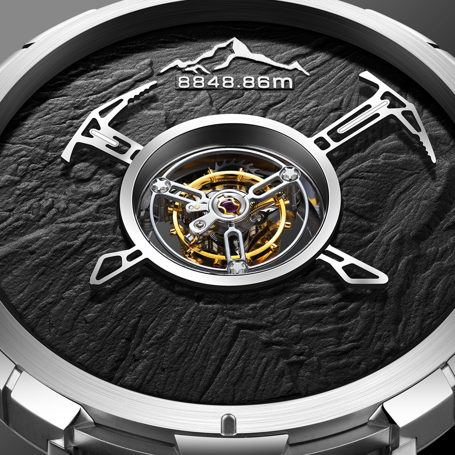 The dial is made from Everest bedrock collected at the mountain’s foothills and then processed (cutting, CNC engraving, and laser shaping) to preserve natural texture while achieving consistent thickness and fit. A raised Everest relief is filled with Swiss Super-LumiNova C1 for low-light visibility. Time is indicated by ice-axe-shaped Super-LumiNova hands; the open profile keeps the central mechanism unobstructed. The display is hours and minutes only; the tourbillon’s one-minute rotation serves as a running indicator.