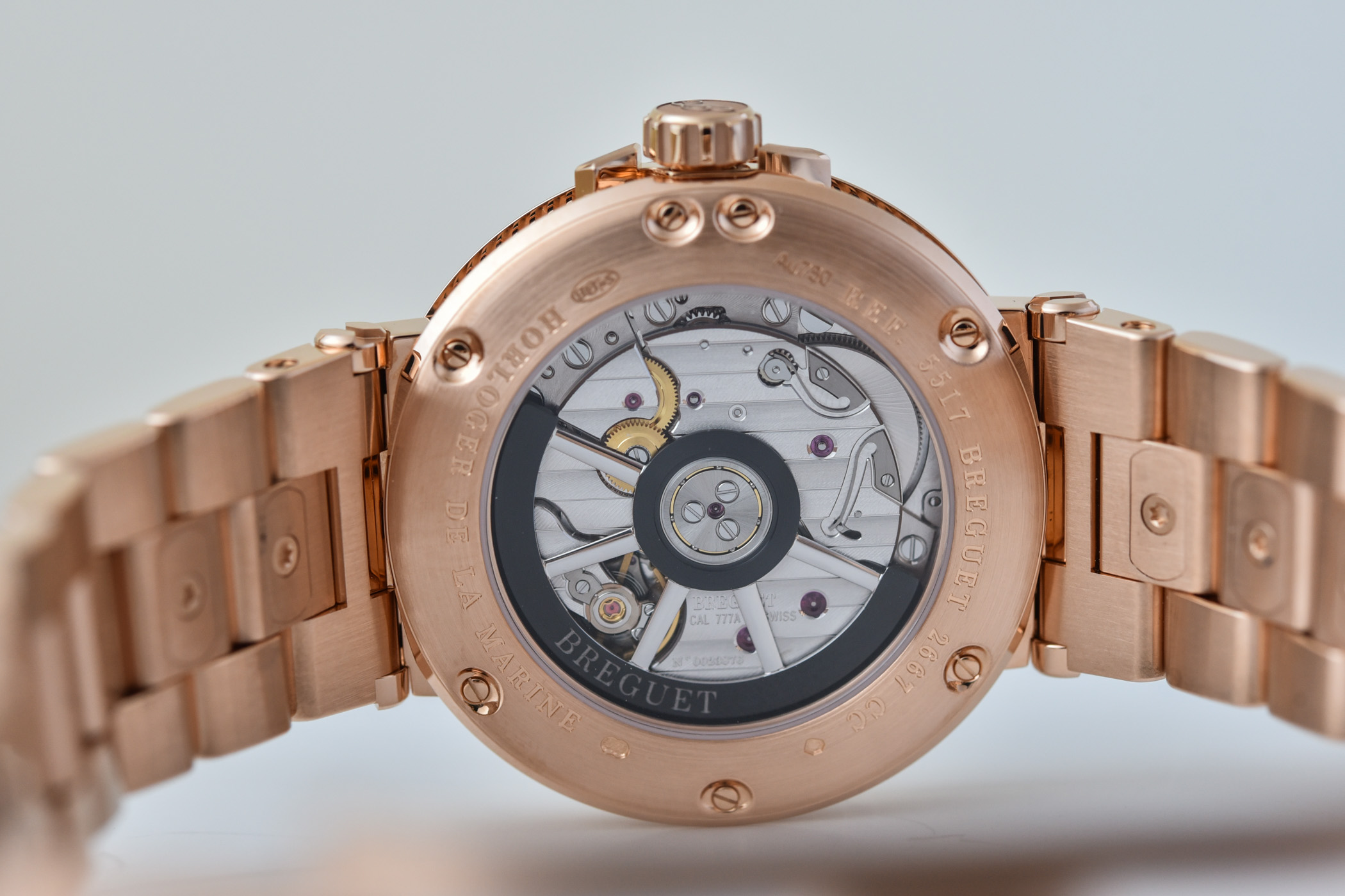The second addition to the collection concerns the 18k rose gold models – again, for the 5517, 5527, and 5547 watches. Until now, rose gold was combined with a silver-coloured dial, which had a hand-applied guilloché pattern with a wave decoration. For 2021, the Breguet Marine collection is enlarged with a slate-grey dial on the rose gold watches; a warmer, darker tone of grey that heightens the contrast and gives the watch an even more luxurious feel. This slate-grey dial will be available on a brown alligator strap, a black rubber strap or a solid 18k gold bracelet.
