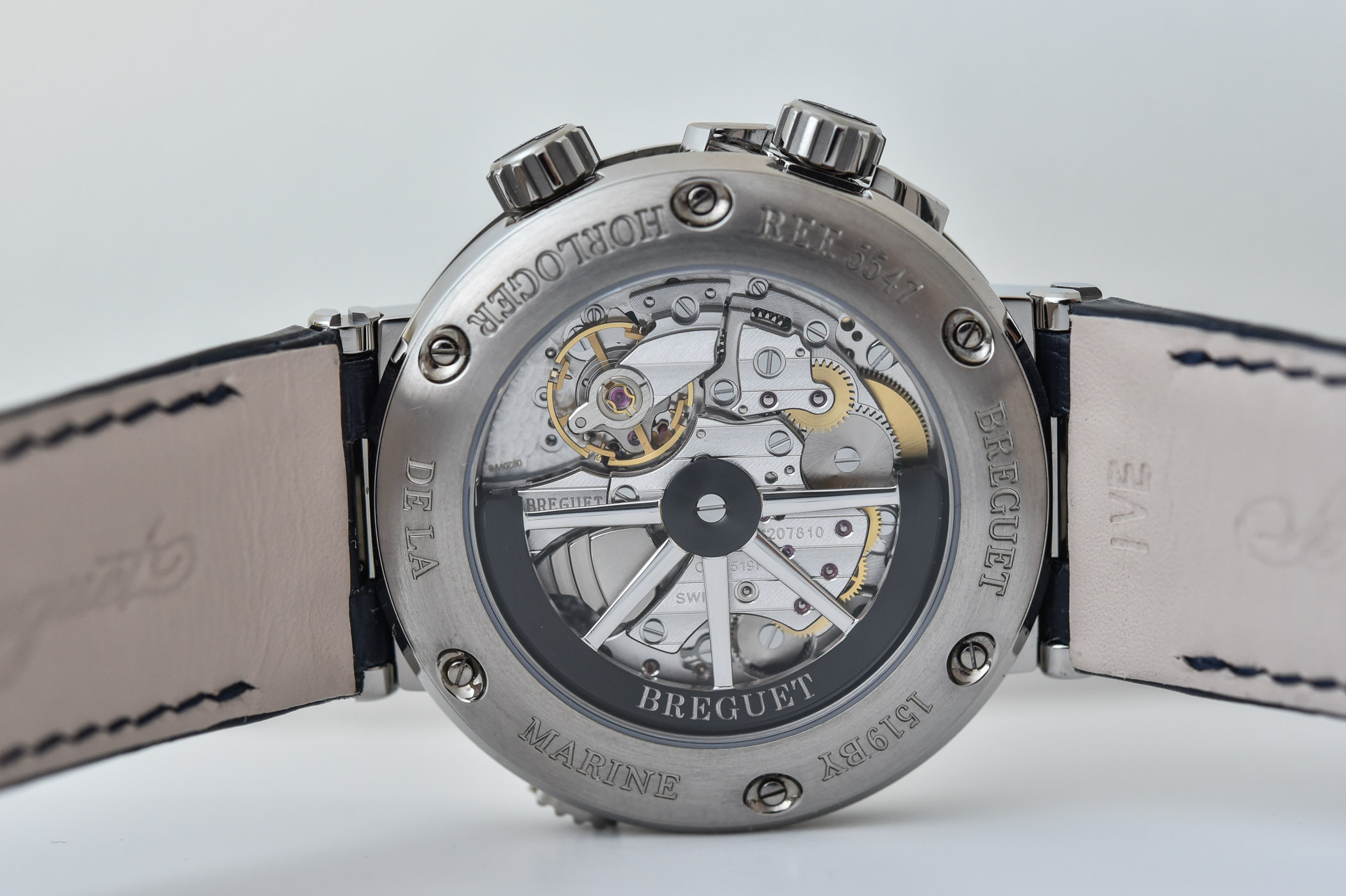 The second model in the Breguet Marine collection is clearly the sportiest of the three, not only because of its complication but also because of its size. Indeed, this model is larger than the two others, with a 42.3mm diameter and a 13.85mm height. This larger case remains water-resistant to 100m and retains all the design elements of the classic model.