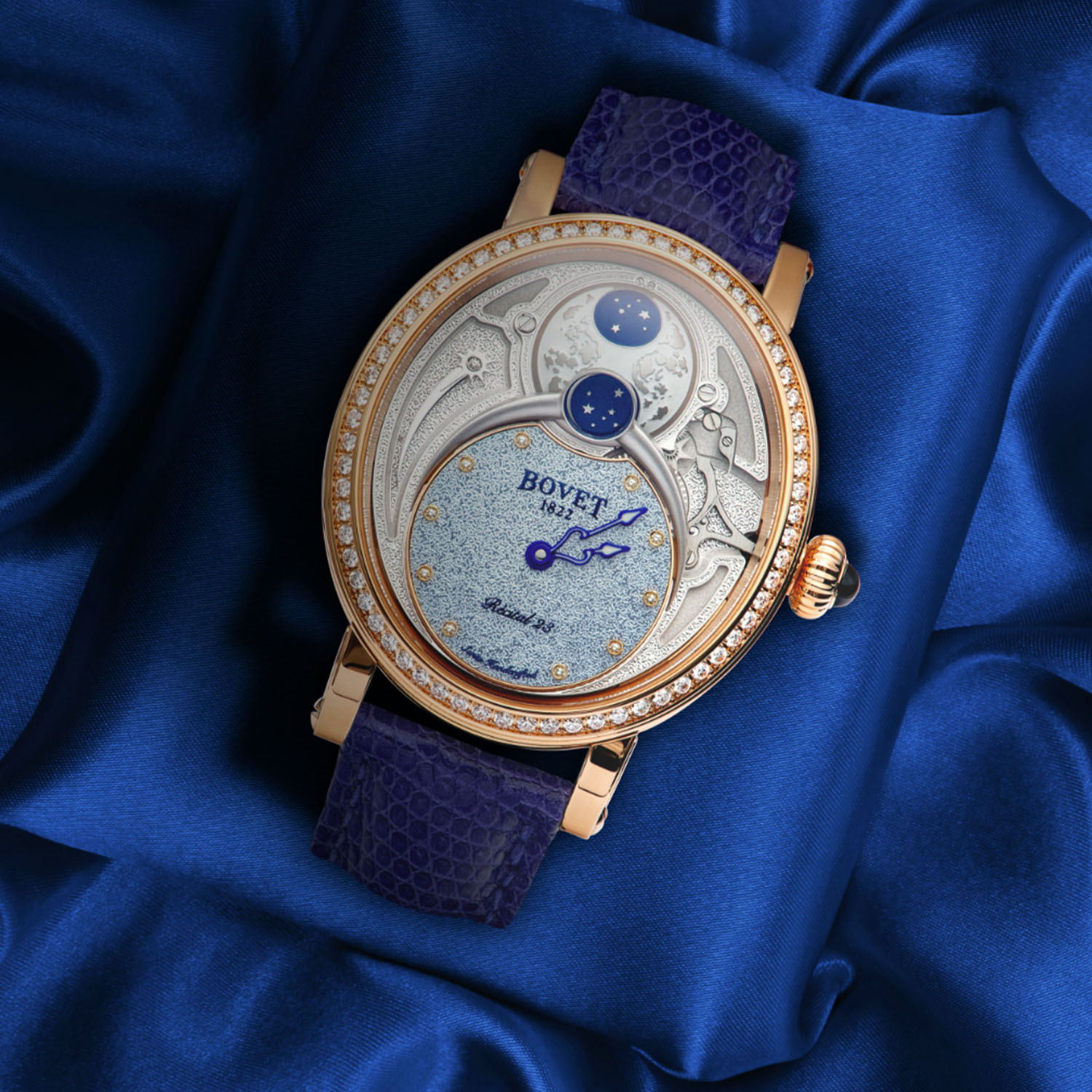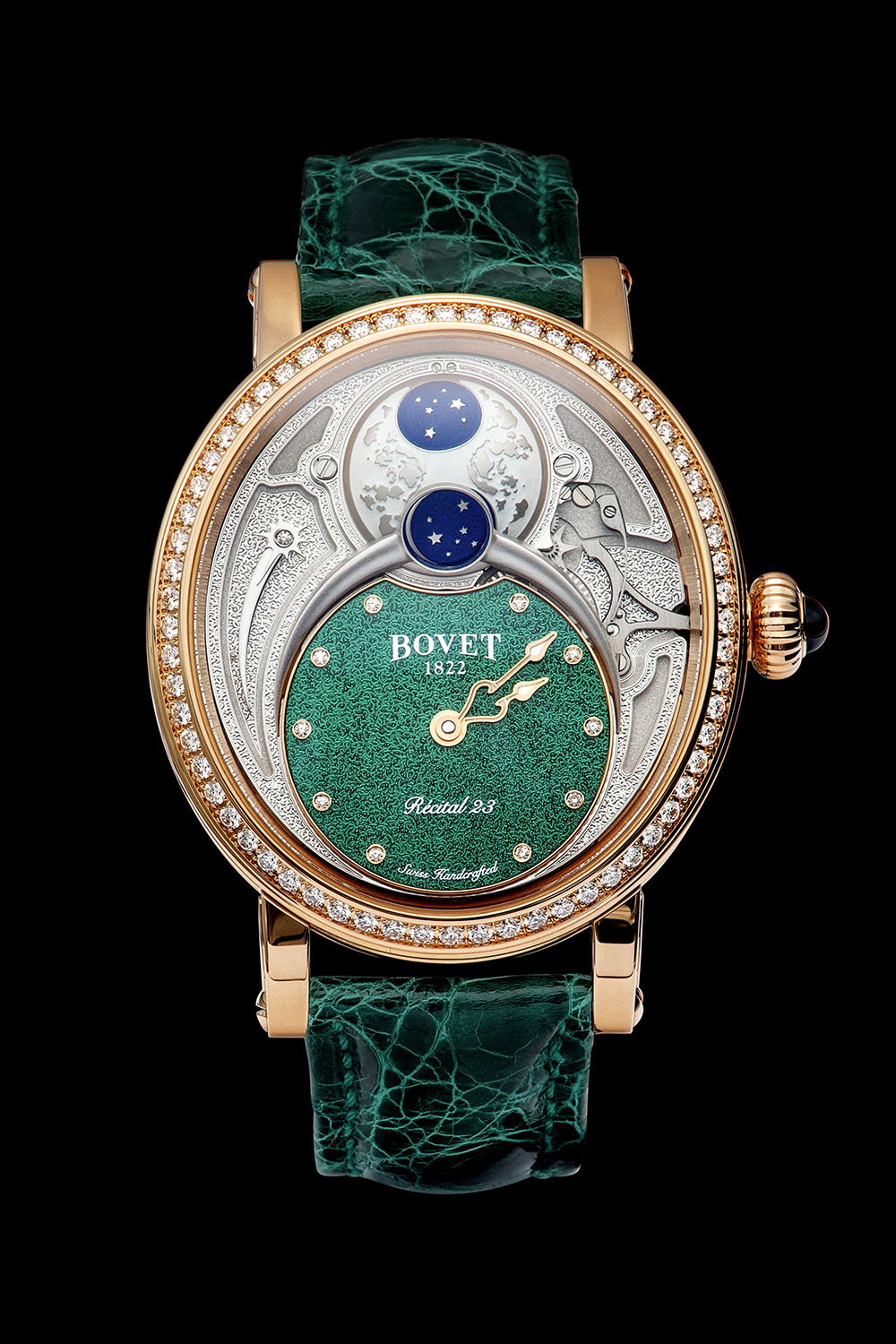 Chiselled and lacquered baby blue and vibrant green dials grace Bovet’s Récital 23 with its characteristic sloping case and domed moon phase indicator.