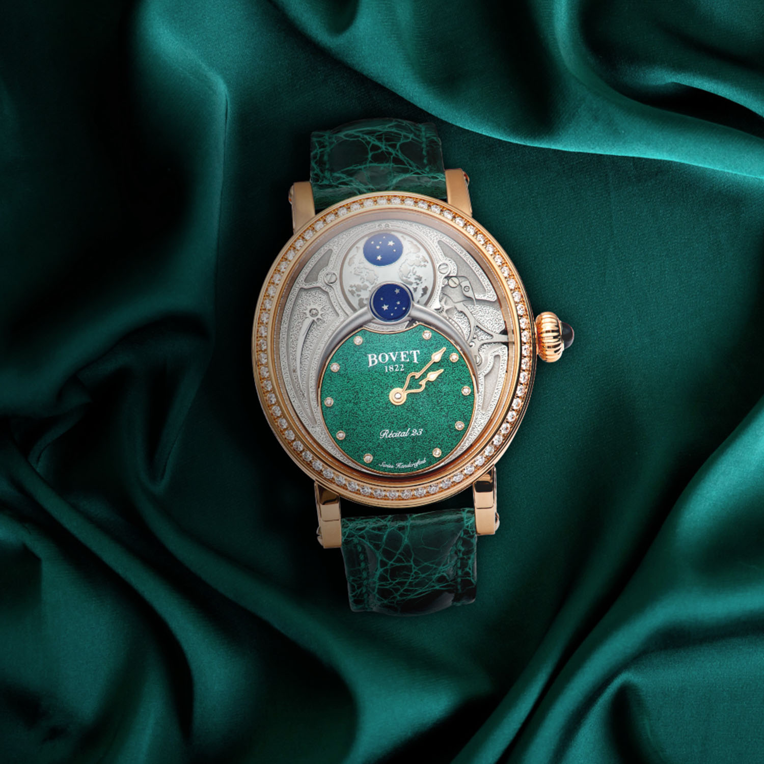 Bovet towers above conventional watchmakers with its complex in-house movements, dramatically staged complications, and lavish artistic flourishes that give its watches their unique and highly expressive character. The Récital 23, Bovet’s first women’s watch with a ‘writing slope’ case and a three-dimensional moon phase indicator, returns with new textured baby blue and vibrant green dial colours and dazzling diamond-set cases.