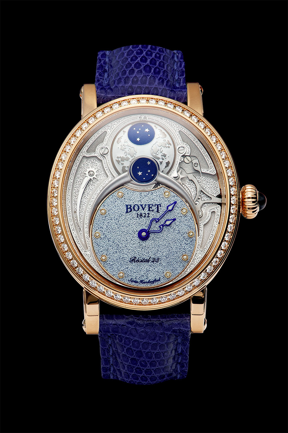 The hemispherical moon phase display performs its cycle at noon and is indicated by the circular aperture whose arms embrace the time sub-dial. According to the press release, this structure alone takes more than a day’s work to produce. The domed indicator is engraved by hand to evoke the lunar surface and is filled with luminescent material emitting a blue and green glow in the dark. Powered by a precision mechanism, the moon phase requires only one correction once every 122 years. To make the function even more practical, Pascal Raffy, the owner of Bovet, has incorporated a push button in the sapphire cabochon of the large onion-shaped crown facilitating the adjustment of the moon phase, a simple way of correcting the current phase without any tools.