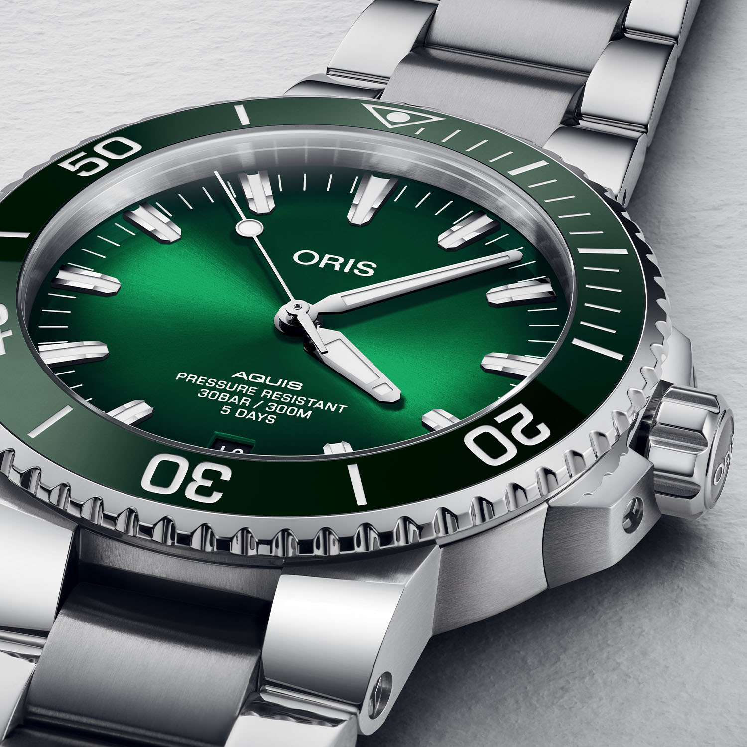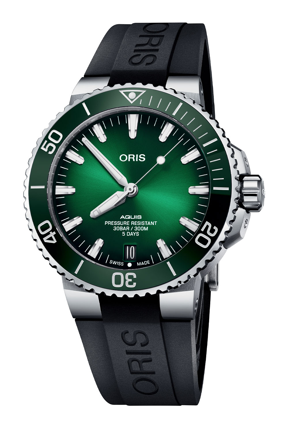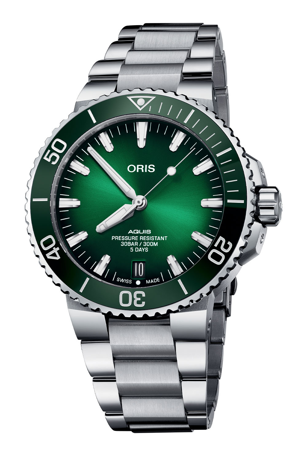 Quick facts: 43.5mm diameter – stainless steel – green ceramic insert in bezel – screw-down crown with guards – 300m water-resistant – gradient green dial – indices and hands with SLN – date at 6 o’clock – proprietary Oris calibre 400 automatic – 5-day power reserve – anti-magnetic components – h,m,s, date and stop-seconds – stainless steel bracelet (ref. 01 400 7763 4157-07 8 24 09PEB) CHF 3,500 – black rubber strap (ref. 01 400 7763 4157-07 4 24 74EB) CHF 3,400